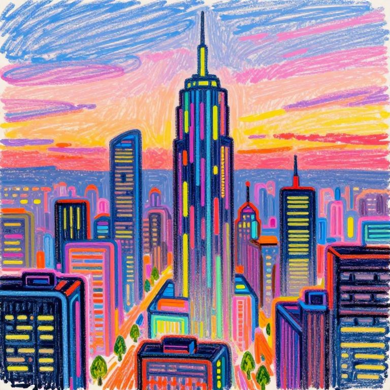 Crayon AI drawing depicting a futuristic cityscape at sunset, colorful crayon lines combined with smooth AI enhancements creating a lively urban scene, playful and detailed with a mix of neon lights and soft natural elements in the horizon.