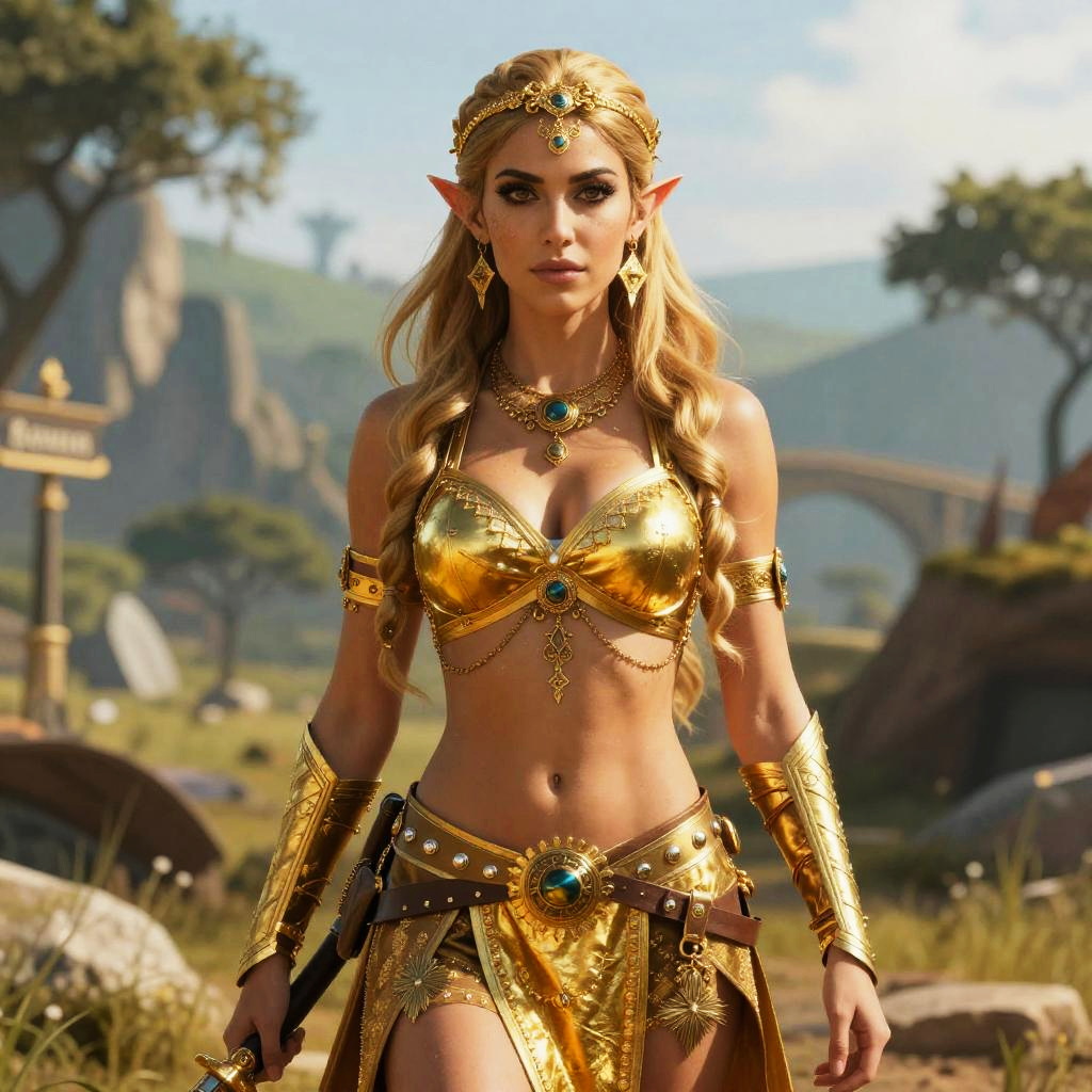 Realistic photo.Middle-Eastern female warrior, mysterious, Carmen Sandiego inspired, gold, in the style of Legend of Zelda Breath of the Wild, highly detailed background, ultra-realistic, hyper-detailed 8k realistic photo