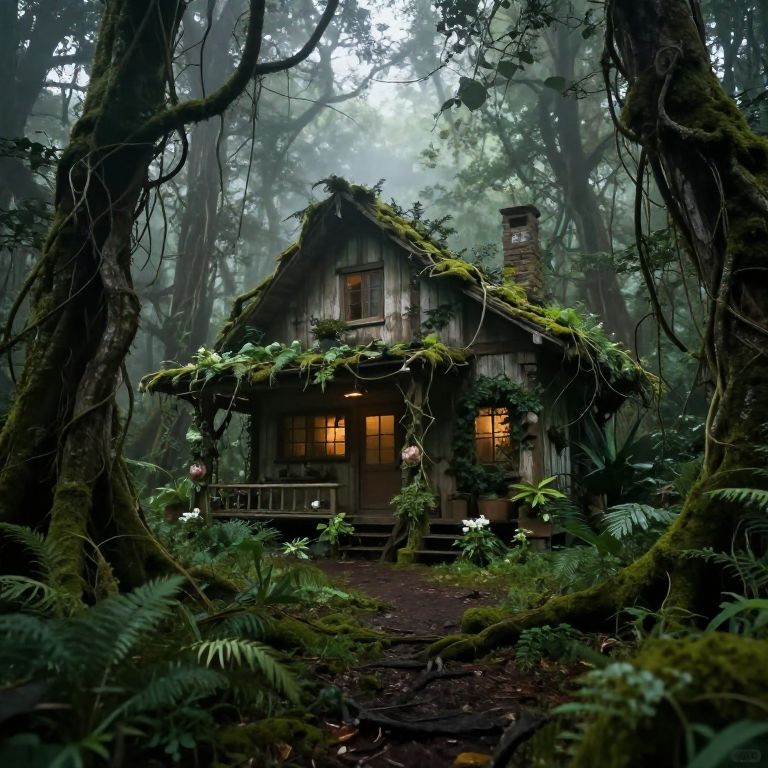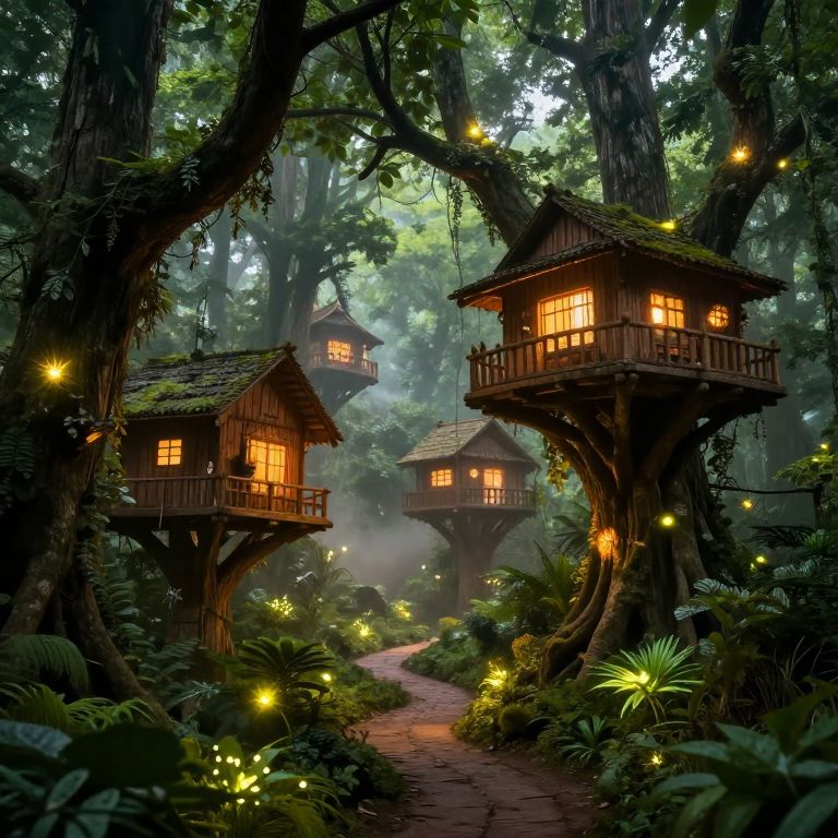 Digital illustration of a mystical forest scene featuring three wooden treehouses with glowing yellow-orange windows, perched on sturdy, twisted tree trunks. A winding, dirt path leads through lush, green ferns and foliage, illuminated by floating, ethereal fireflies. Soft, misty light filters through the dense canopy above, creating a magical, serene atmosphere. The treehouses have moss-covered roofs and wooden railings, blending seamlessly with the surrounding trees. The overall style is whimsical and enchanting, evoking a sense of fairy tale wonder.