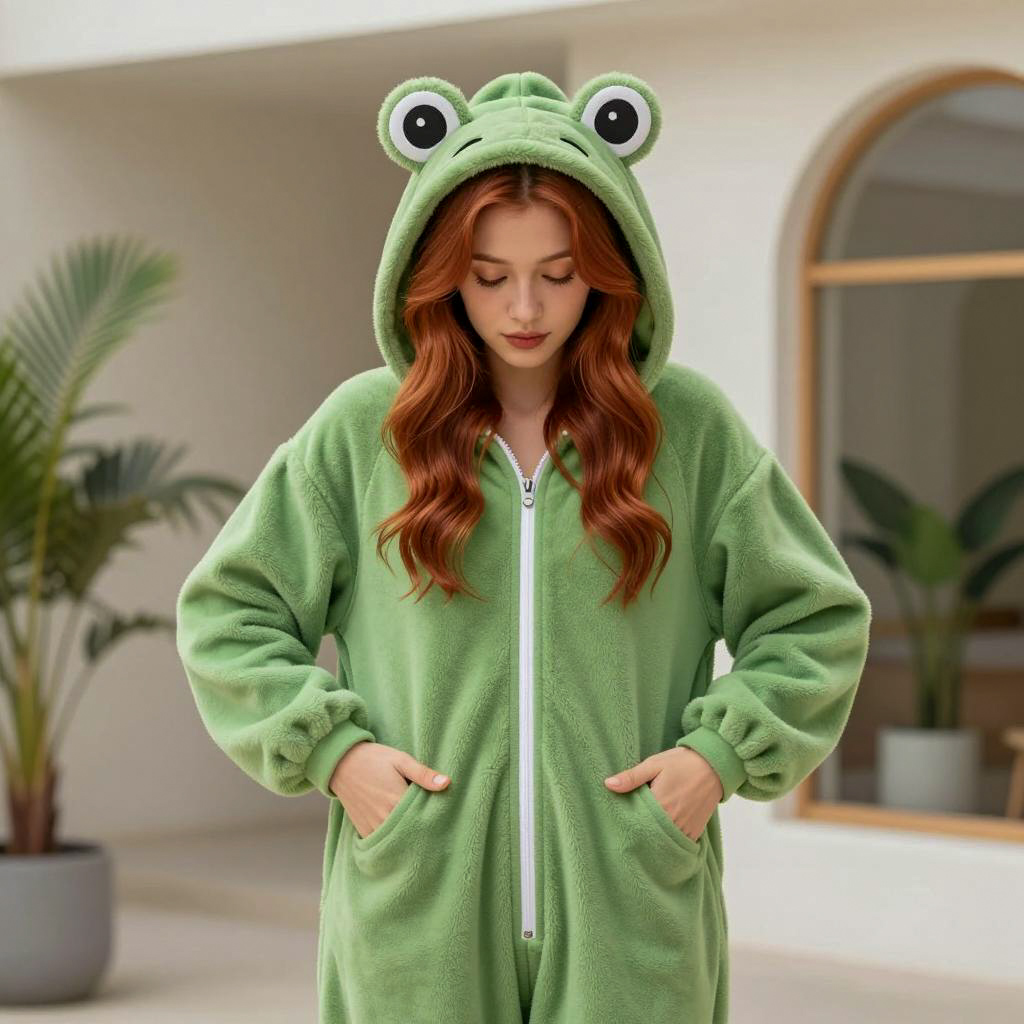 Frog onesie costume, photorealistic, young woman, standing, wearing green frog-themed hooded onesie, long auburn hair, white eyes on hood, cute, indoor, modern building background, soft lighting, hands near waist, casual, comfortable, playful, relaxed expression, daytime, green fleece, white zipper, slightly blurred background, potted plants, arched window, realistic ures, friendly atmosphere, winter outfit