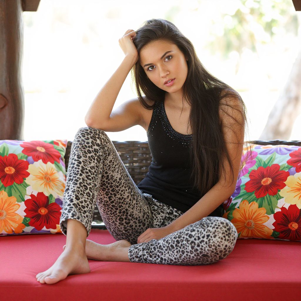 Photograph of a young woman with long dark hair, sitting on a red cushioned wicker daybed. She's wearing a black top with a sparkly neckline and patterned, leopard-print pants. She's leaning back with one hand in her hair, looking directly at the camera. The background is bright, with sunlight streaming through trees. Colorful floral pillows are on either side of her.