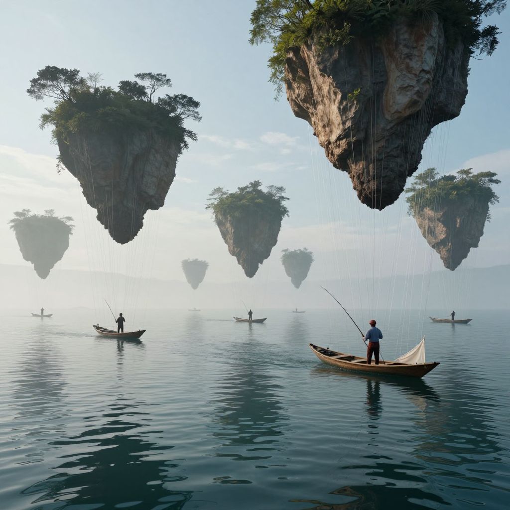 Surreal Fishermen Beneath Floating Islands