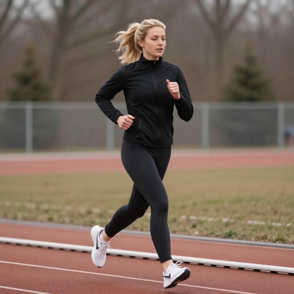 Photograph of a fit woman with light blonde hair in a ponytail, running on a red track. She wears a black zip-up jacket and black pants, with white sneakers. Her expression is focused, and she is mid-stride, with her arms bent and hands clenched. Bare trees and a white fence are in the blurred background.