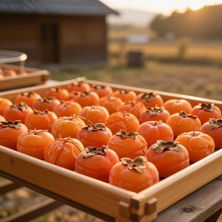 Hoshigaki drying under a delicate golden sunlight, traditional Japanese wooden tray with tied persimmons, rustic rustic rural background, soft focus, warm autumn colors, detailed textures of wrinkled fruit skin, serene and peaceful atmosphere
