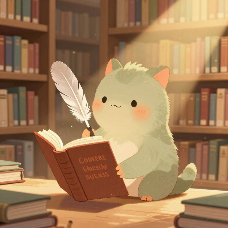Adorable, fluffy green cat writing with a white feather quill on a "Conveniently Tiny Book" in a sunlit library. Digital art