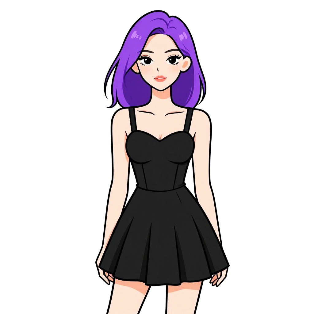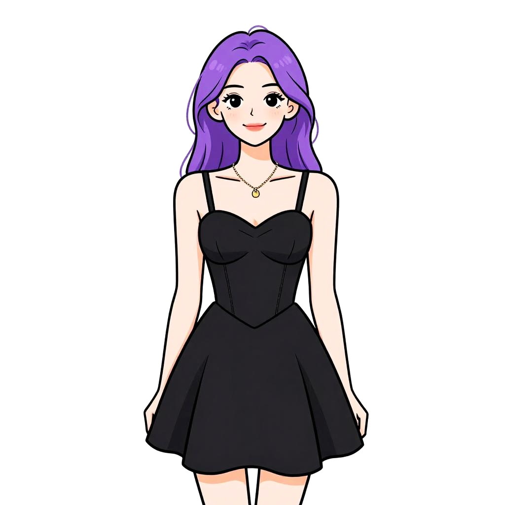 Digital anime-style drawing of a smiling young woman with long black hair, wearing a lilac, sleeveless, form-fitting dress and a necklace,