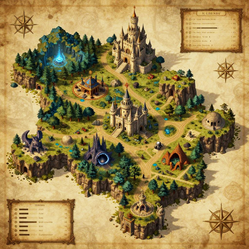 Map generator DnD fantasy landscape, sprawling kingdoms, magical forests, dragon lairs, dungeons, castles perched on cliffs, stylized with old map elements like compass roses and scale bars, warm earth tones, immersive fantasy RPG environment