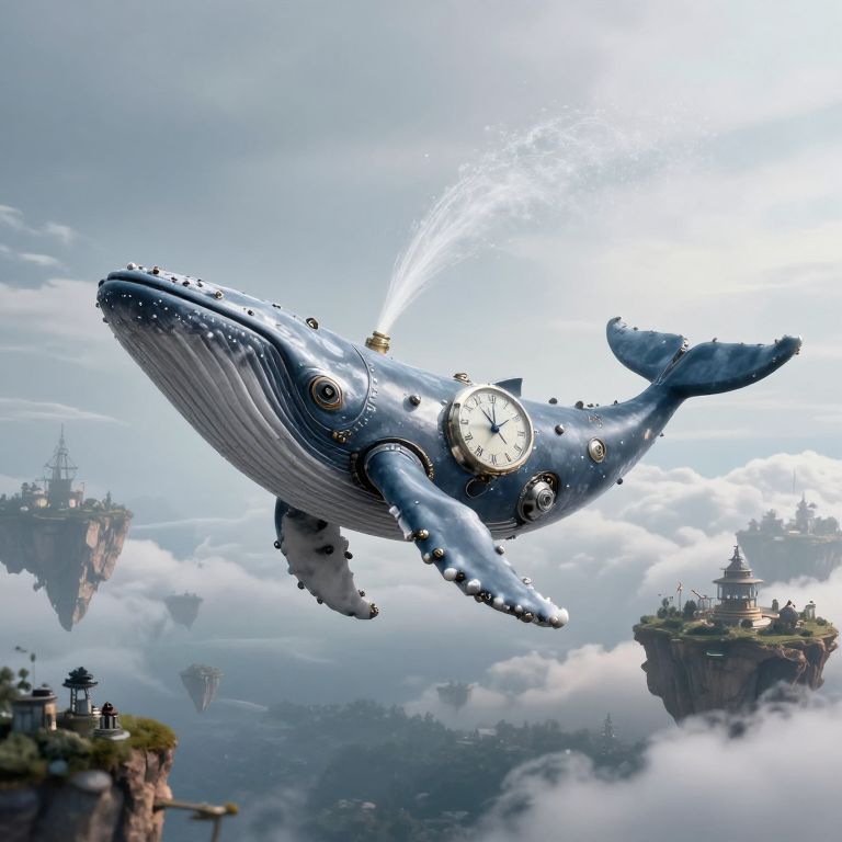 Amidst a dreamlike expanse of floating islands and ethereal clouds, a colossal clockwork whale drifts serenely, its mechanical heart ticking the rhythm of time while spouting oil—a poignant symbol of humanity's enduring quest for progress, tinged with the melancholy of its ecological cost.
