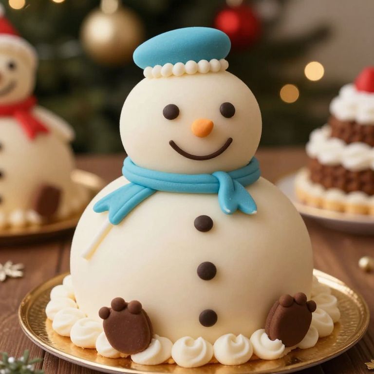 Photograph of a festive snowman cake with blue hat, scarf, and buttons, surrounded by Christmas decorations and other cakes.