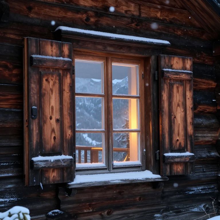 Rustic fenstern on a cozy alpine cabin, snow gently falling outside, warm light spilling through the window panes, wooden shutters open, mountain landscape visible, atmospheric winter scene, textures of frost and aged timber
