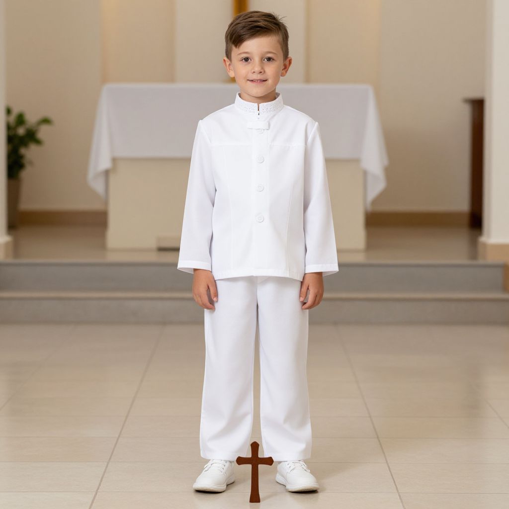 Kid Christening Outfit Costume, boy in white outfit standing in a hall with a cross on the floor