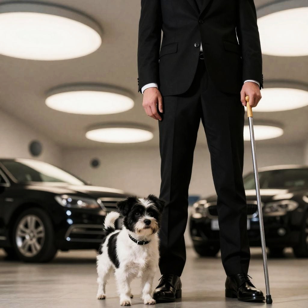 Photograph of a man in a black suit standing tall, holding a cane, with a small black and white dog at his feet. Background has black cars in a room with circular white ceiling lights and gray wall spheres.