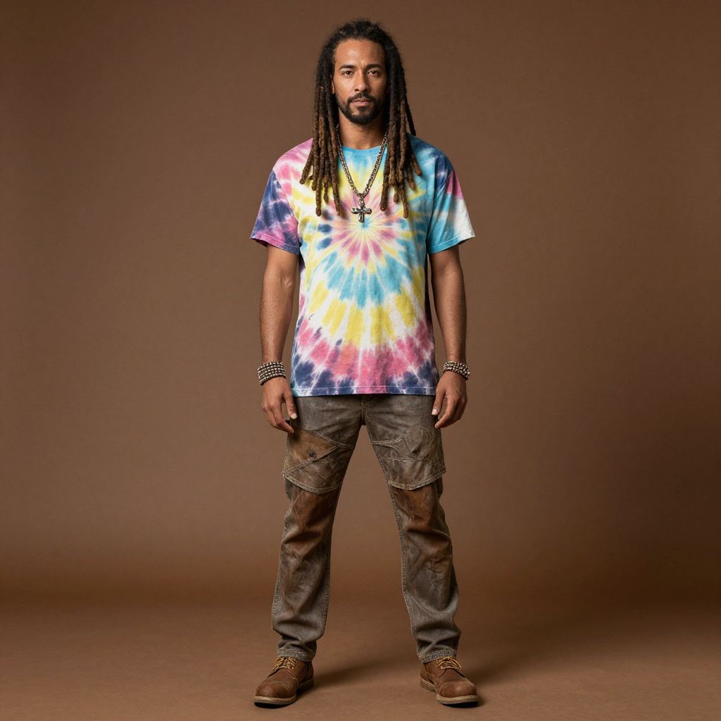 Tie Dye Hippie Costume, man with dreadlocks and a tie dye shirt