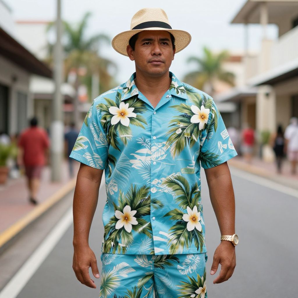 Tropical Outfit Costume, man wearing a hat and hawaiian shirt standing on a street