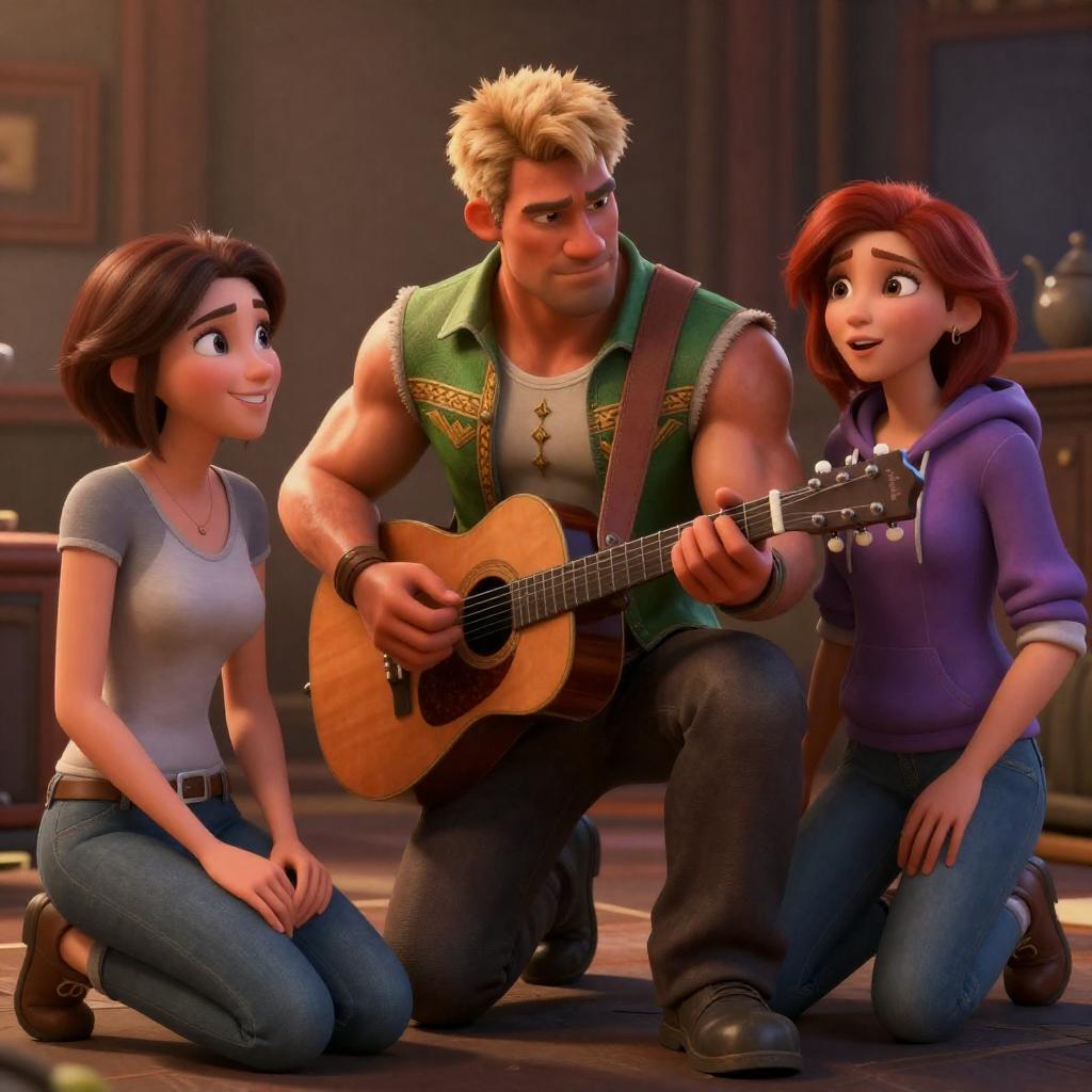 Three CGI characters in a dimly lit room. A muscular man with short blonde hair, wearing a green and gold patterned vest, plays a guitar. A brown-haired woman in a gray shirt and jeans kneels beside him, smiling. A red-haired woman in a purple hoodie looks surprised. The background is blurred with dark wooden furniture.