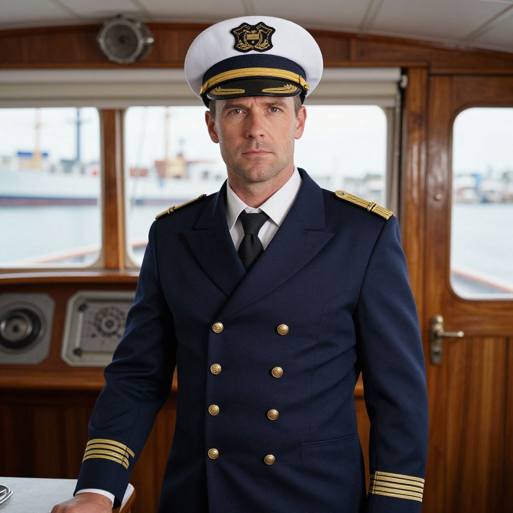 A man dressed as a ship captain in a detailed navy-blue uniform and white captain's hat poses inside a wooden boat cabin, with a harbor and ship in the blurred background. The photorealistic portrait captures the serious and confident expression of the man, showcasing the classic maritime style of the cosplay costume.