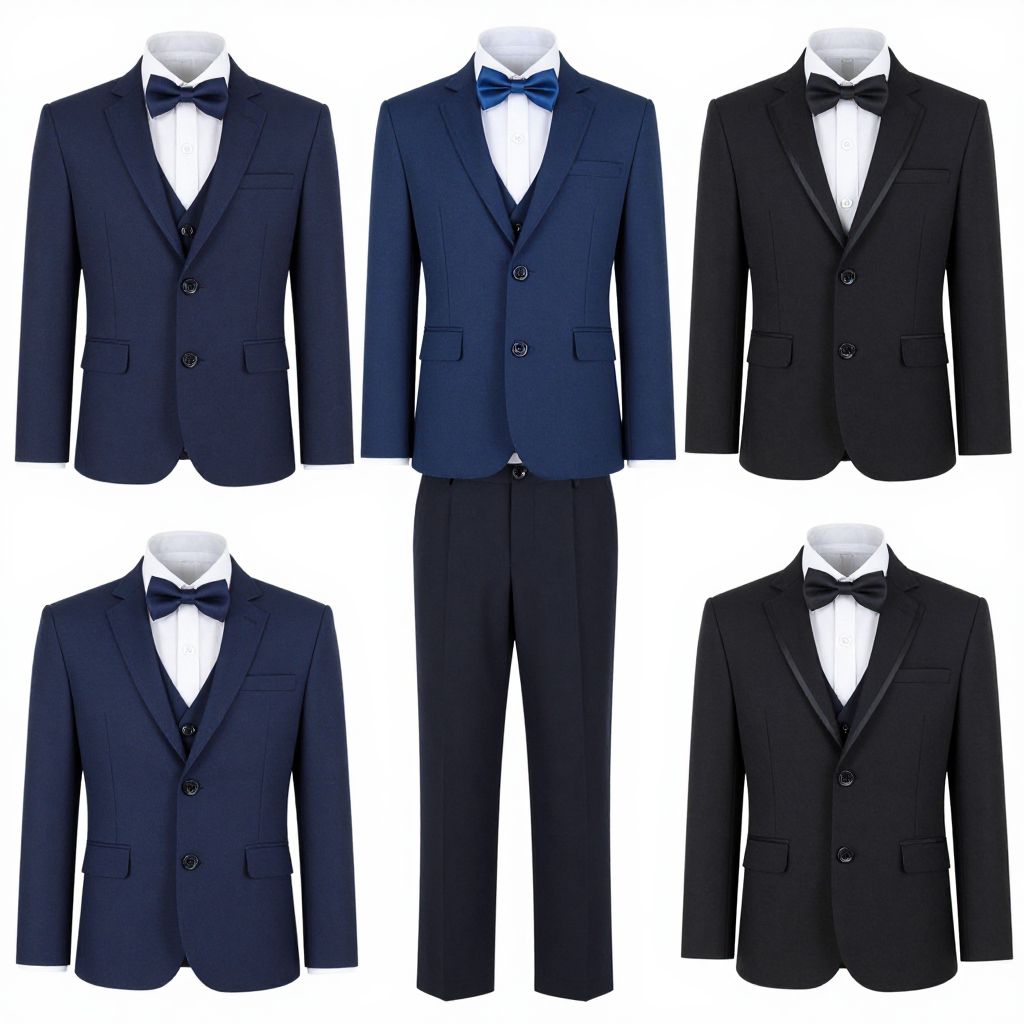 Elegant navy blue and black boys' gentleman suits for weddings and formal events, featuring a blazer, trousers, bow tie, vest, shirt, and a pair of polished black dress shoes, all neatly displayed against a clean white background.