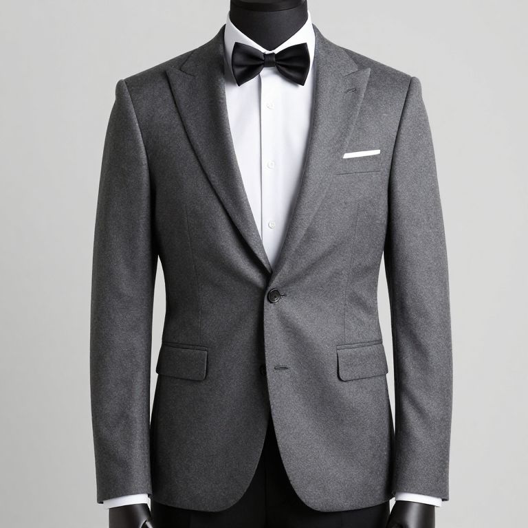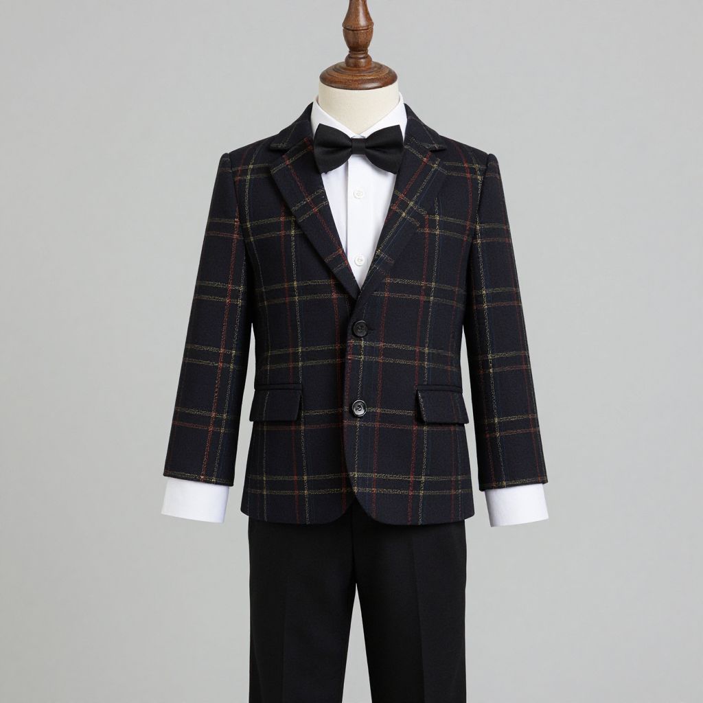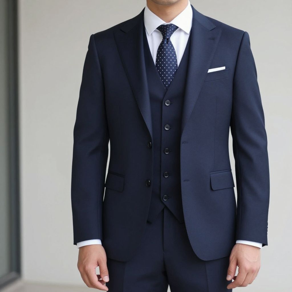 Photograph of a formal men's suit set: navy blazer and pants, white shirt with navy bow tie, black vest, and black dress shoes