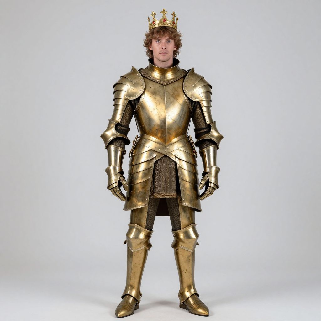 Royal Knight Costume, man in a golden armor and a crown poses for a picture