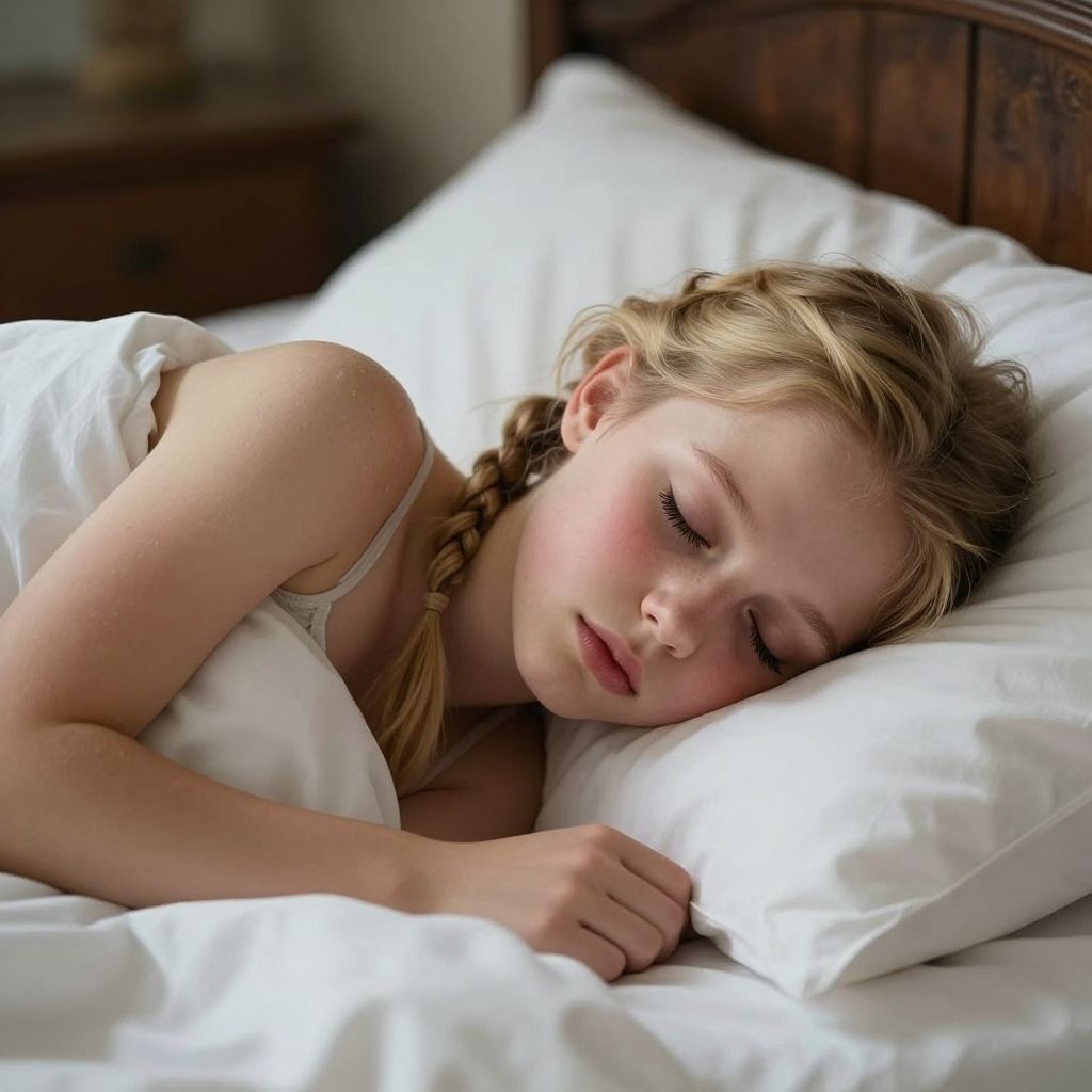 Photograph of a young Caucasian girl with light blonde hair in a single braid, sleeping peacefully in a bed with white pillows and white sheets. She is wearing a light-colored, sleeveless top. Her eyes are closed, and her face is slightly flushed, with a peaceful expression. The wooden headboard is visible in the background. Soft natural light illuminates her face, creating a serene and calm atmosphere. The background is blurred, focusing attention on the girl.