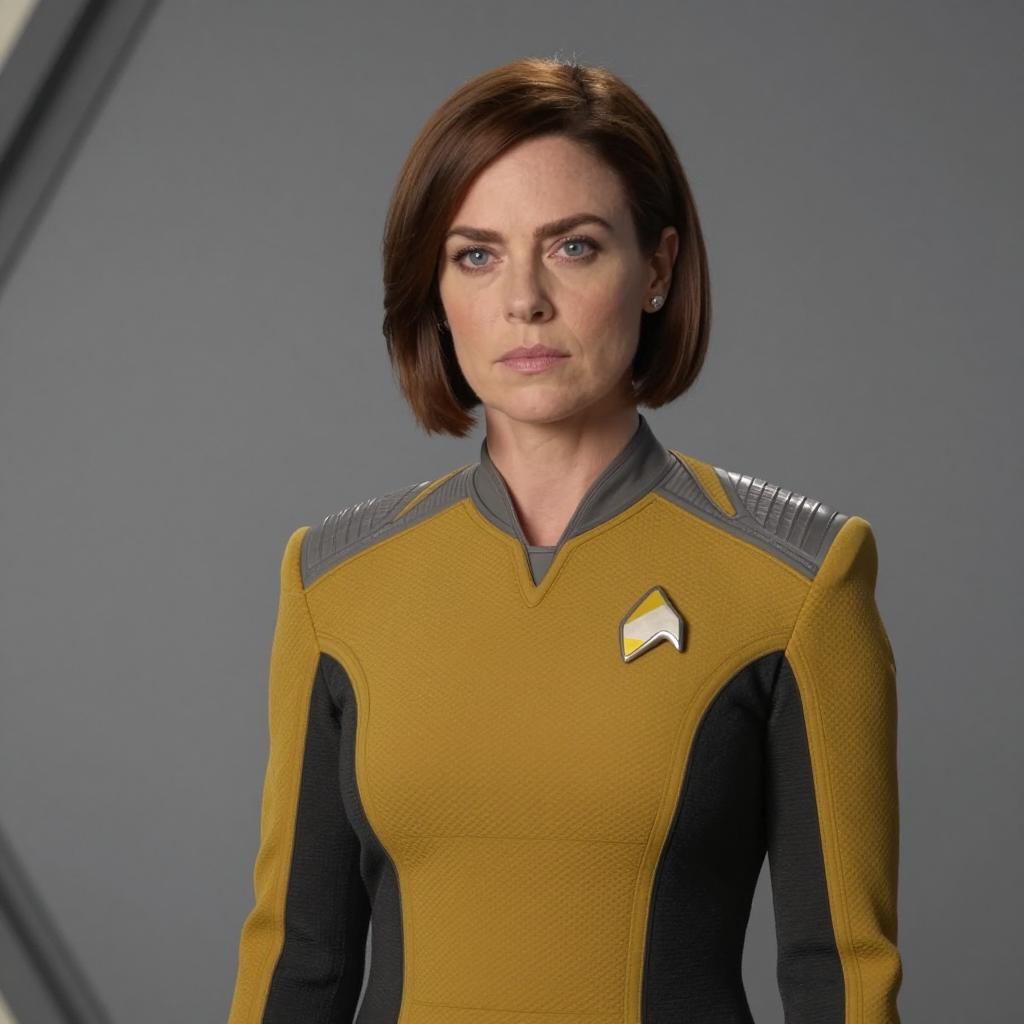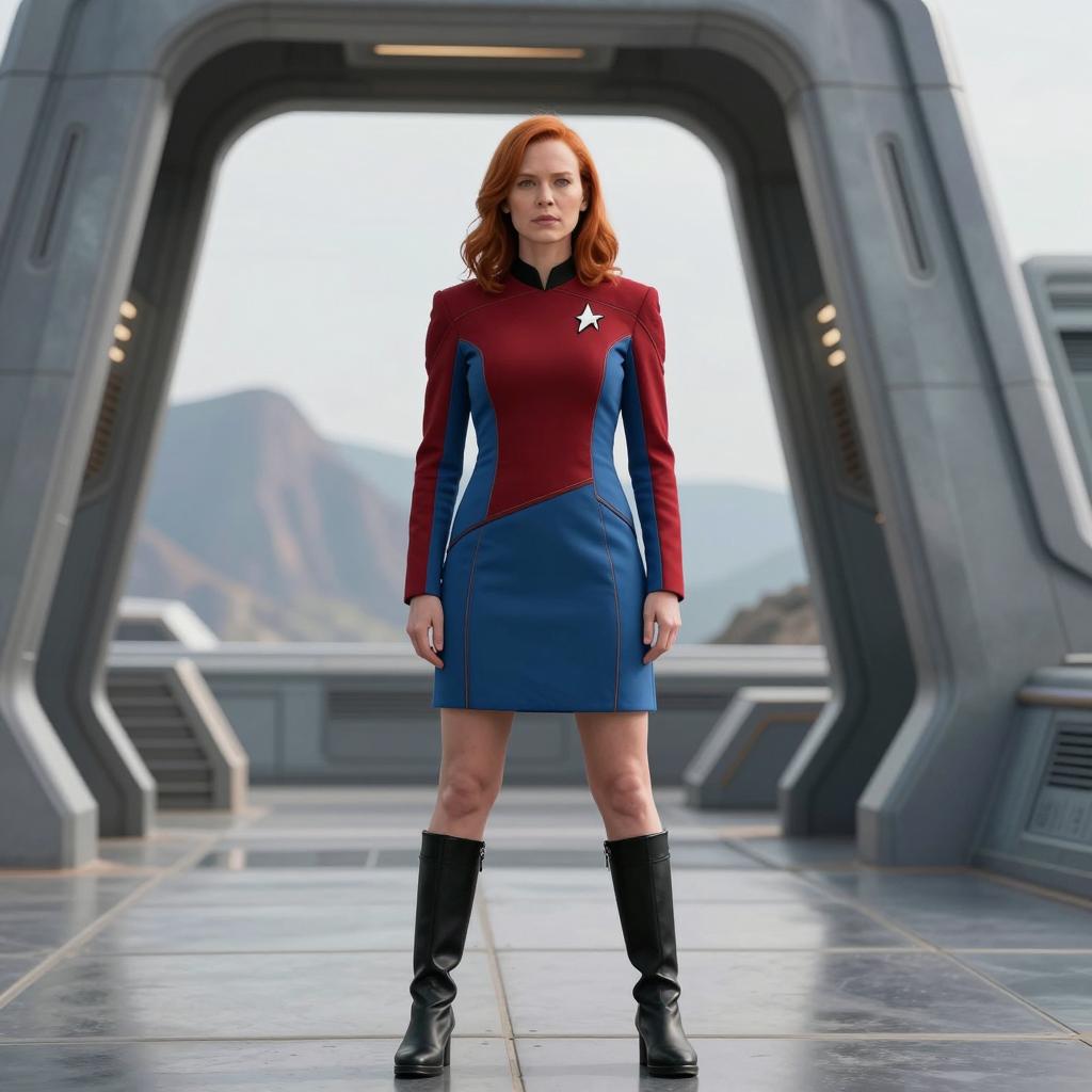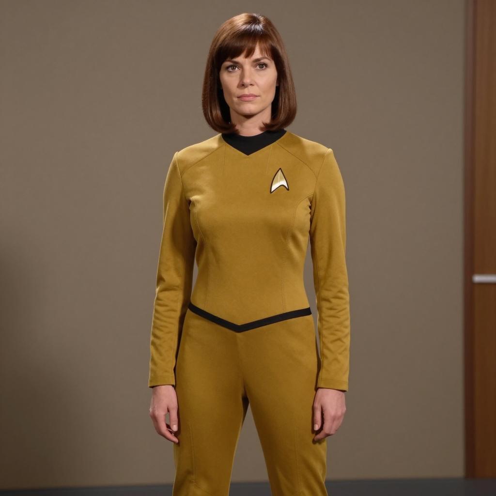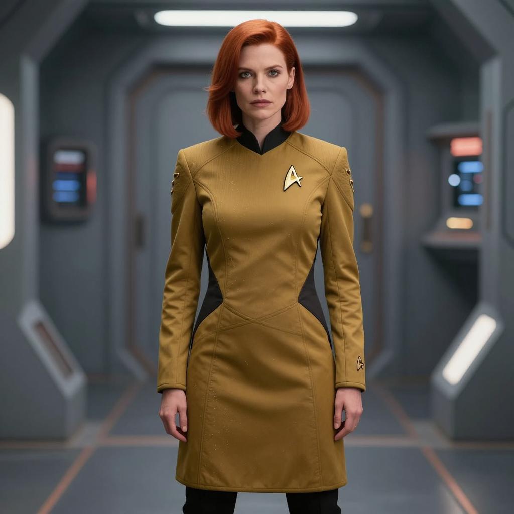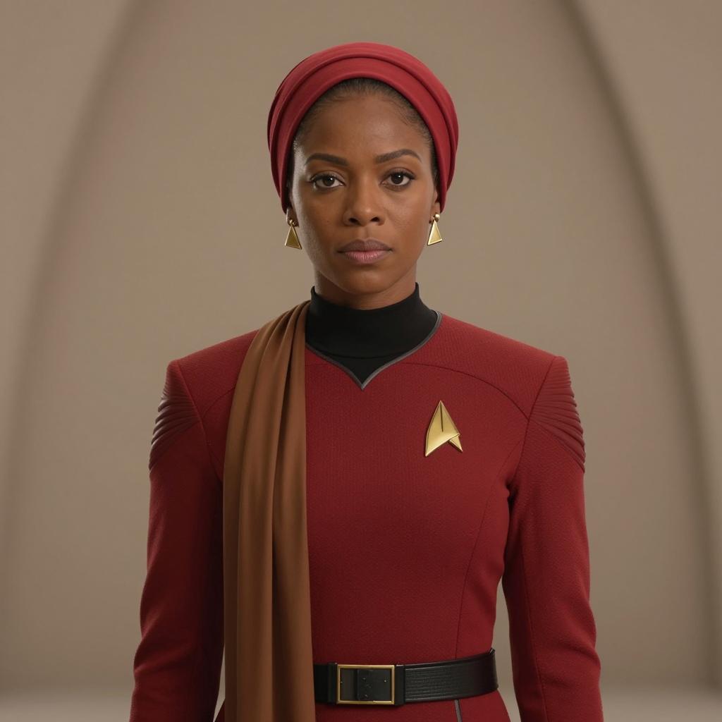 Guinan star trek costume, photo-realistic portrait of an African woman, dark skin, serious expression, red headscarf, gold triangular earrings, black turtleneck, red long-sleeve shirt with gold triangle symbol, brown scarf draped around neck, black belt with gold buckle, blurred beige arched background, subtle lighting, detailed ures, realistic style, CGI, science fiction character, Star Trek: Discovery, Nyota Uhura-inspired, elegant, composed, focused, high-quality, 3D rendering.