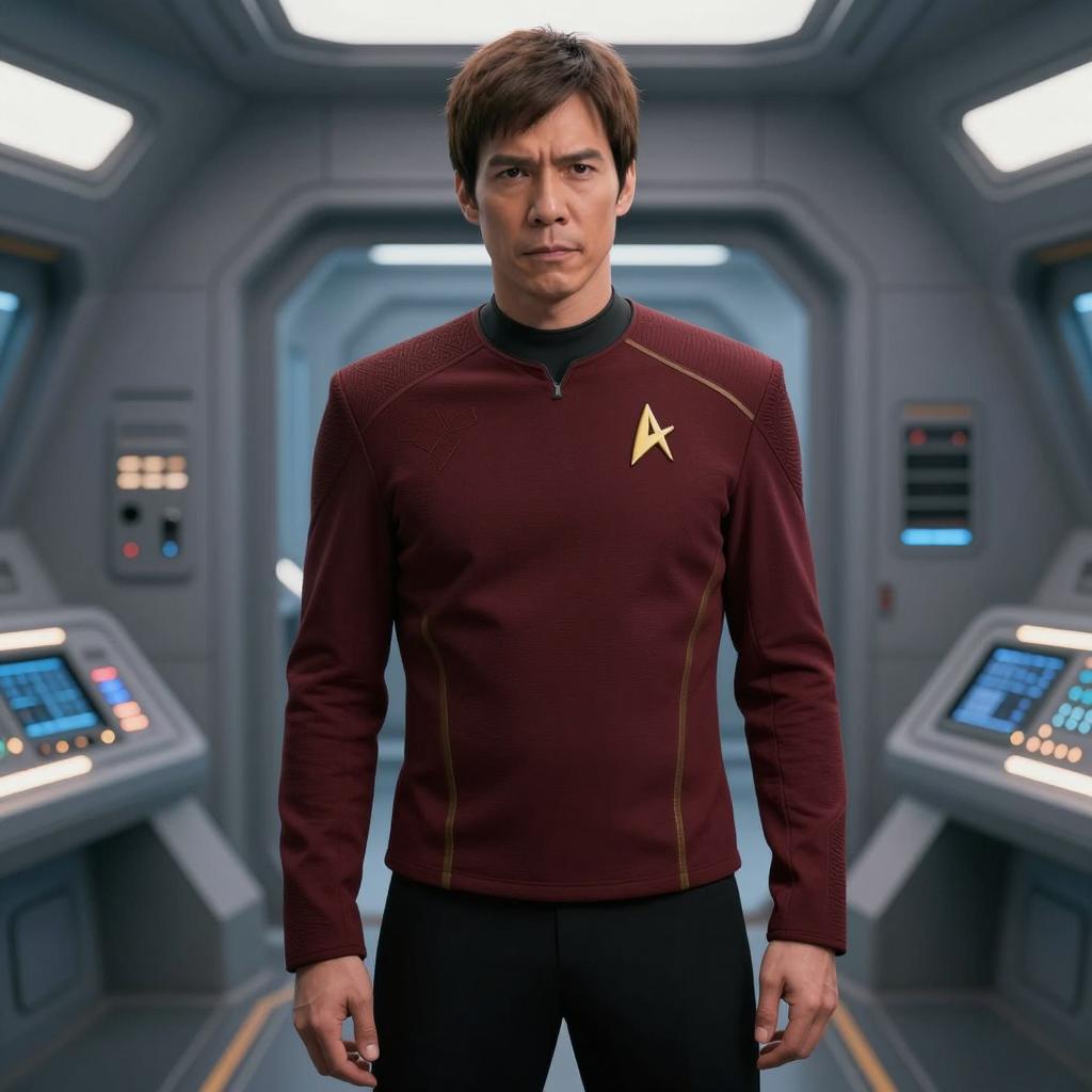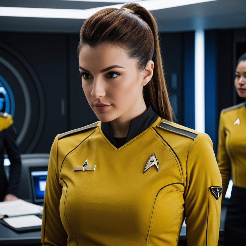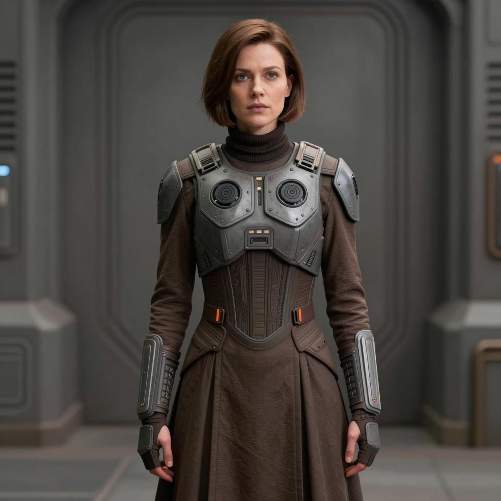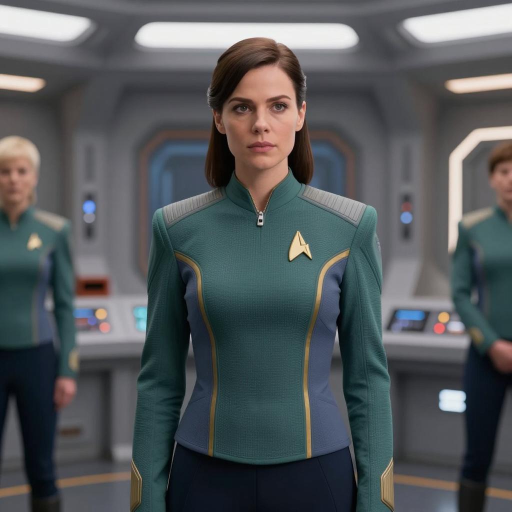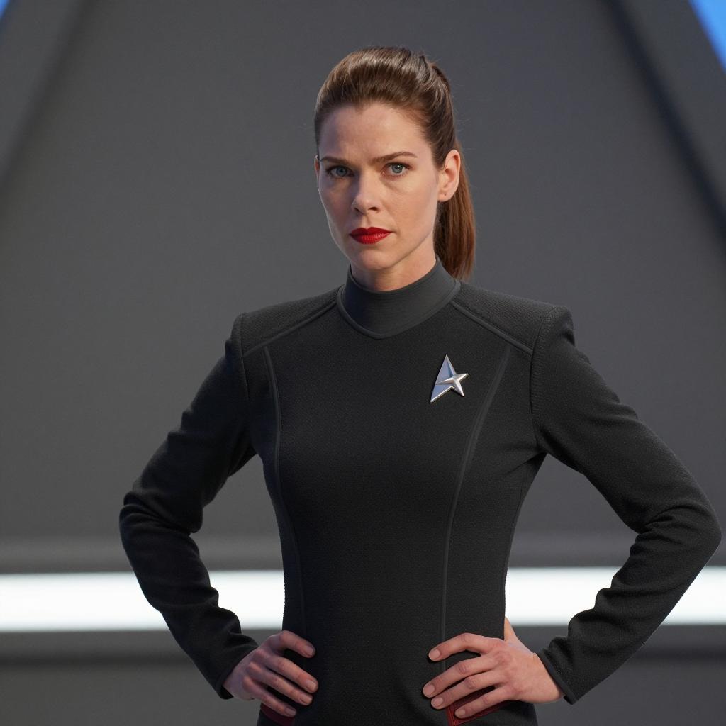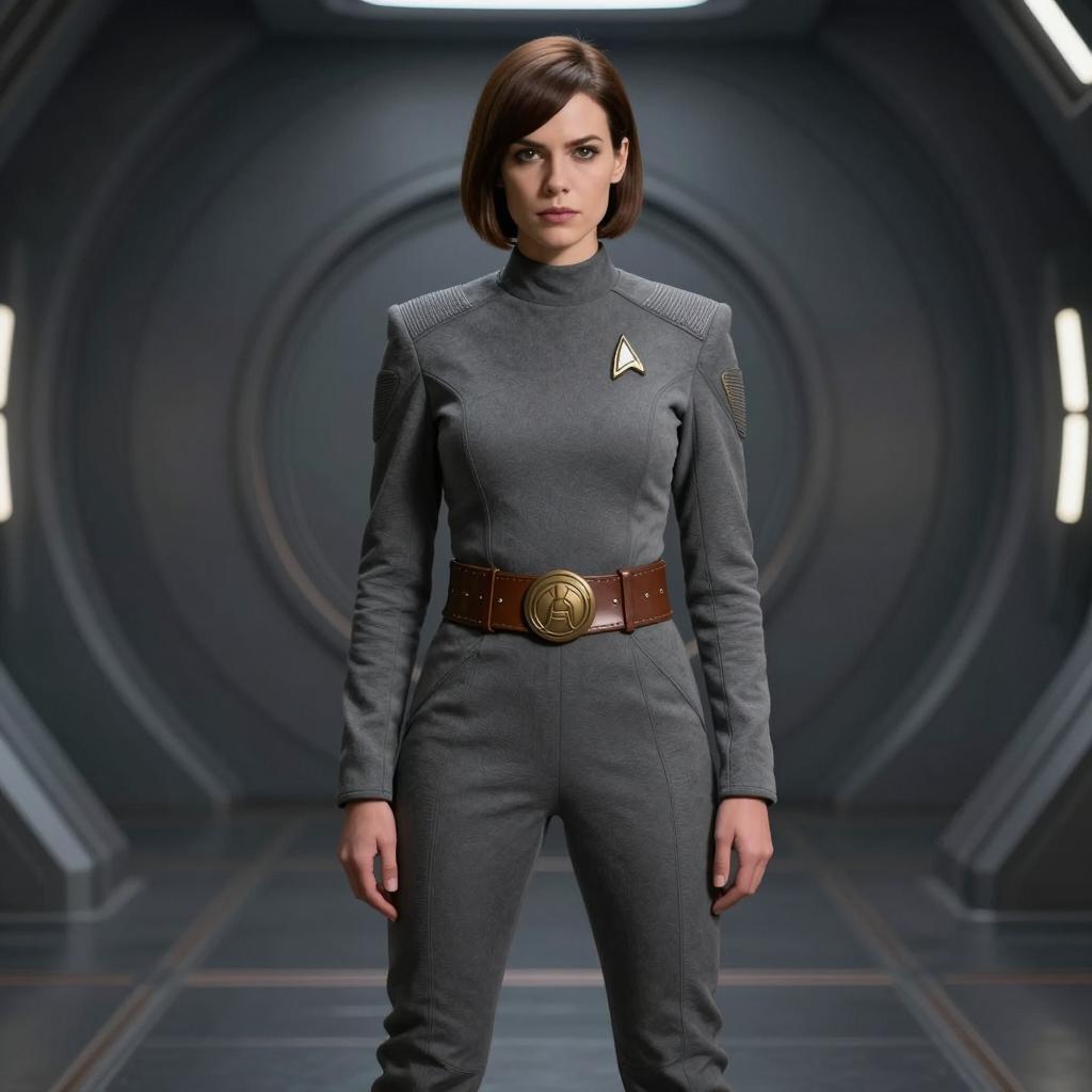 Guinan star trek costume, photo-realistic portrait of an African woman, dark skin, serious expression, red headscarf, gold triangular earrings, black turtleneck, red long-sleeve shirt with gold triangle symbol, brown scarf draped around neck, black belt with gold buckle, blurred beige arched background, subtle lighting, detailed ures, realistic style, CGI, science fiction character, Star Trek: Discovery, Nyota Uhura-inspired, elegant, composed, focused, high-quality, 3D rendering.