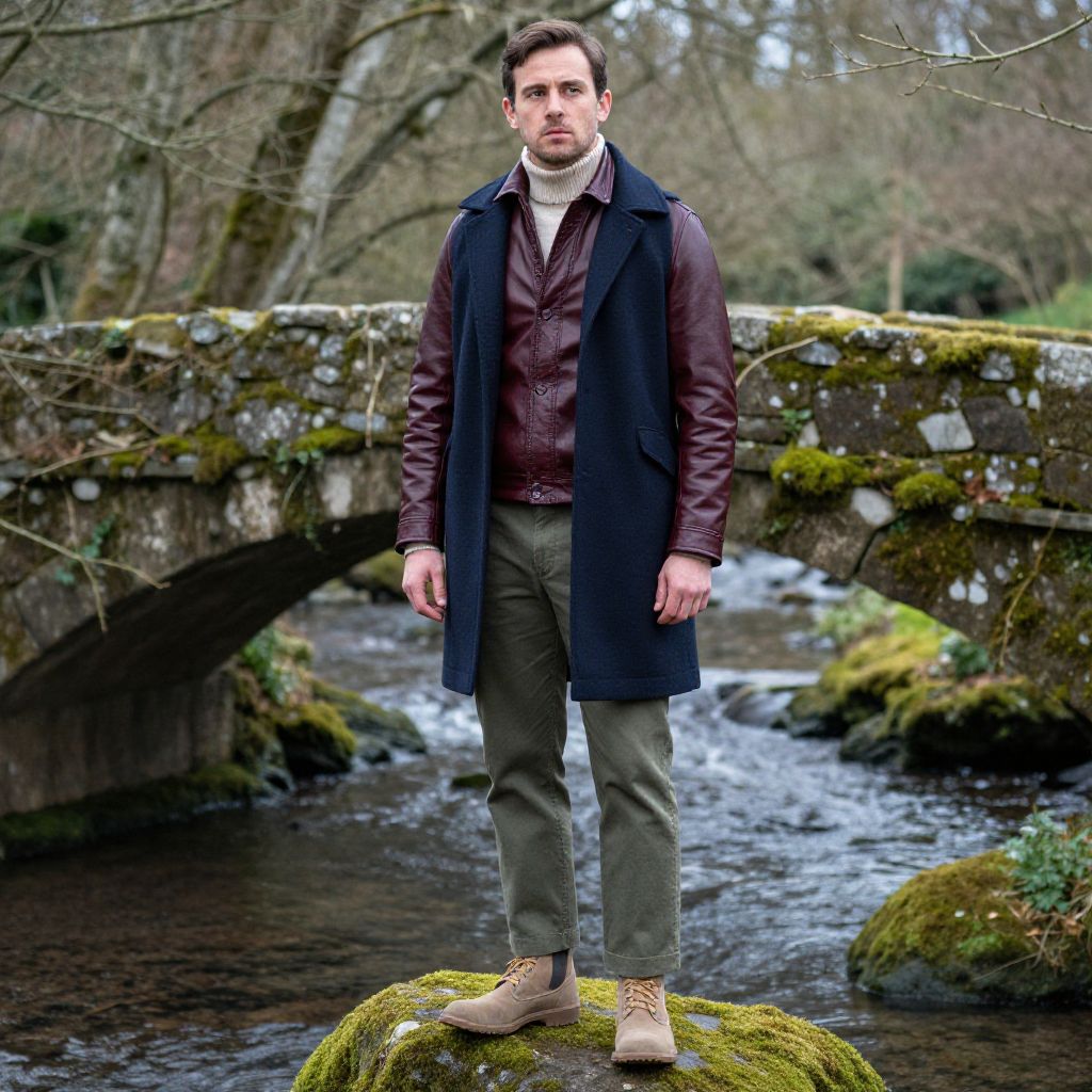 A man, burgundy leather jacket, cream turtleneck, olive green chinos, tan suede desert boots, navy wool overcoat, ancient stone bridge, overgrown with moss, tranquil stream flowing beneath, soft light filtering through trees, lithographic film style, contemplative expression. Man has masculine face and piercing eyes