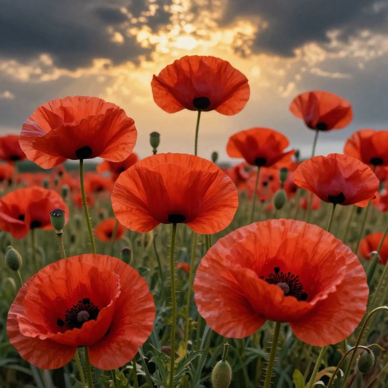 Photograph of vivid red poppies in full bloom against a dramatic sunset sky with dark clouds, capturing the flowers' delicate petals and vibrant colors.