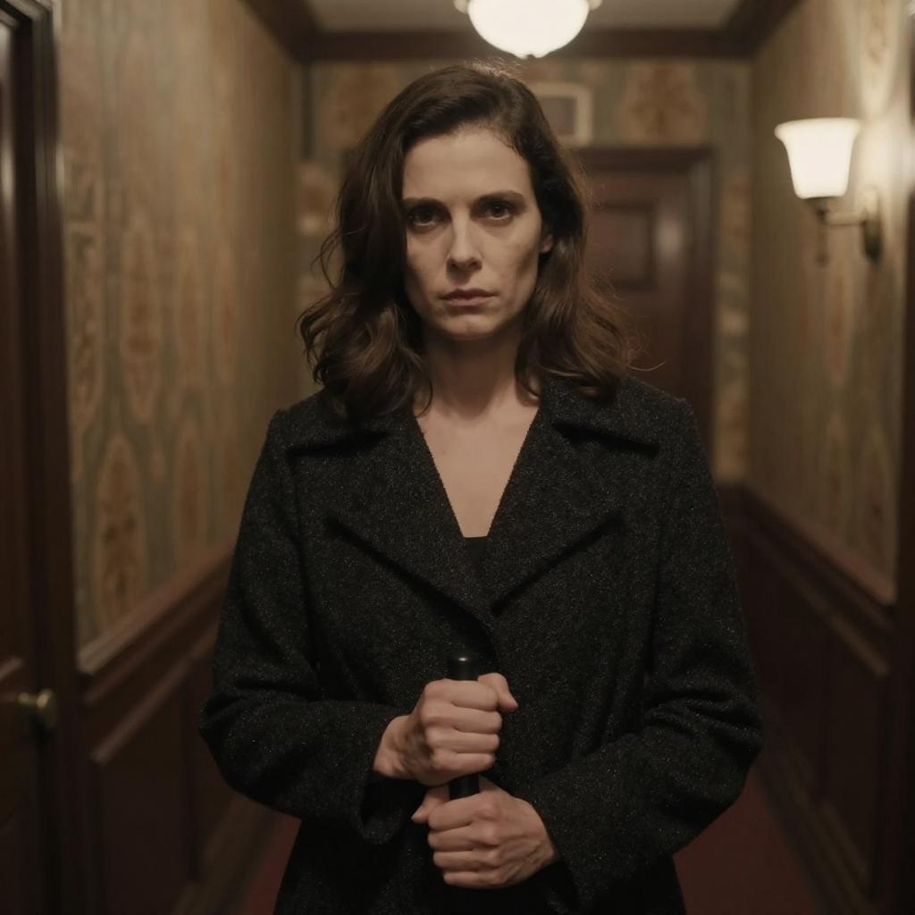 Photograph of a serious-looking woman with pale skin and dark brown, shoulder-length hair, standing in a dimly lit hallway. She's wearing a black, textured coat and gripping a black object with both hands. The background features ornate, patterned wallpaper, a wooden door, and a lit wall sconce, creating a slightly vintage atmosphere. Her intense gaze is directed at the camera.