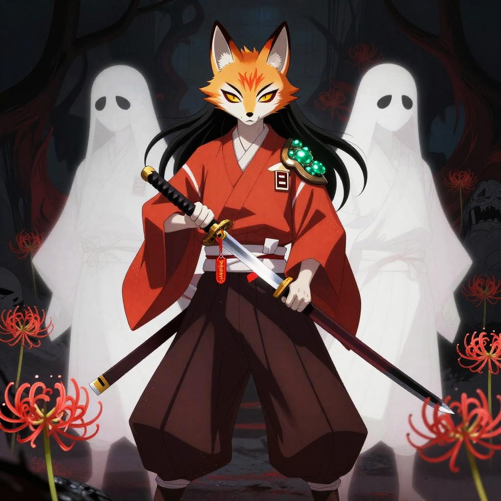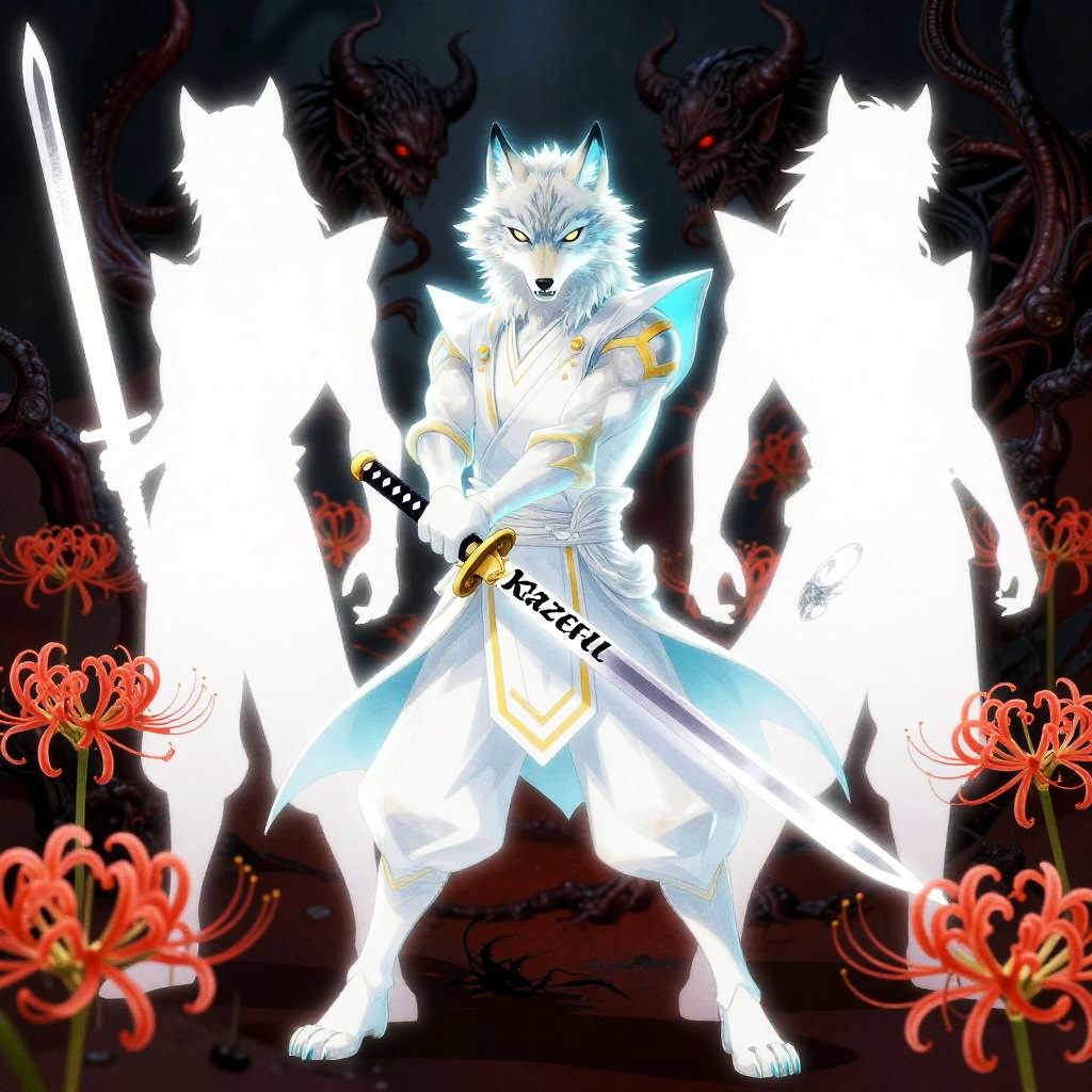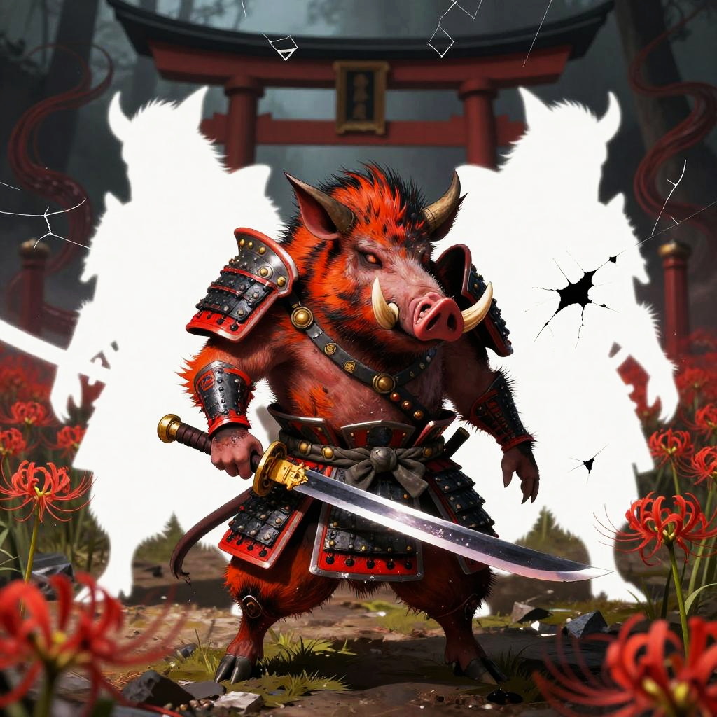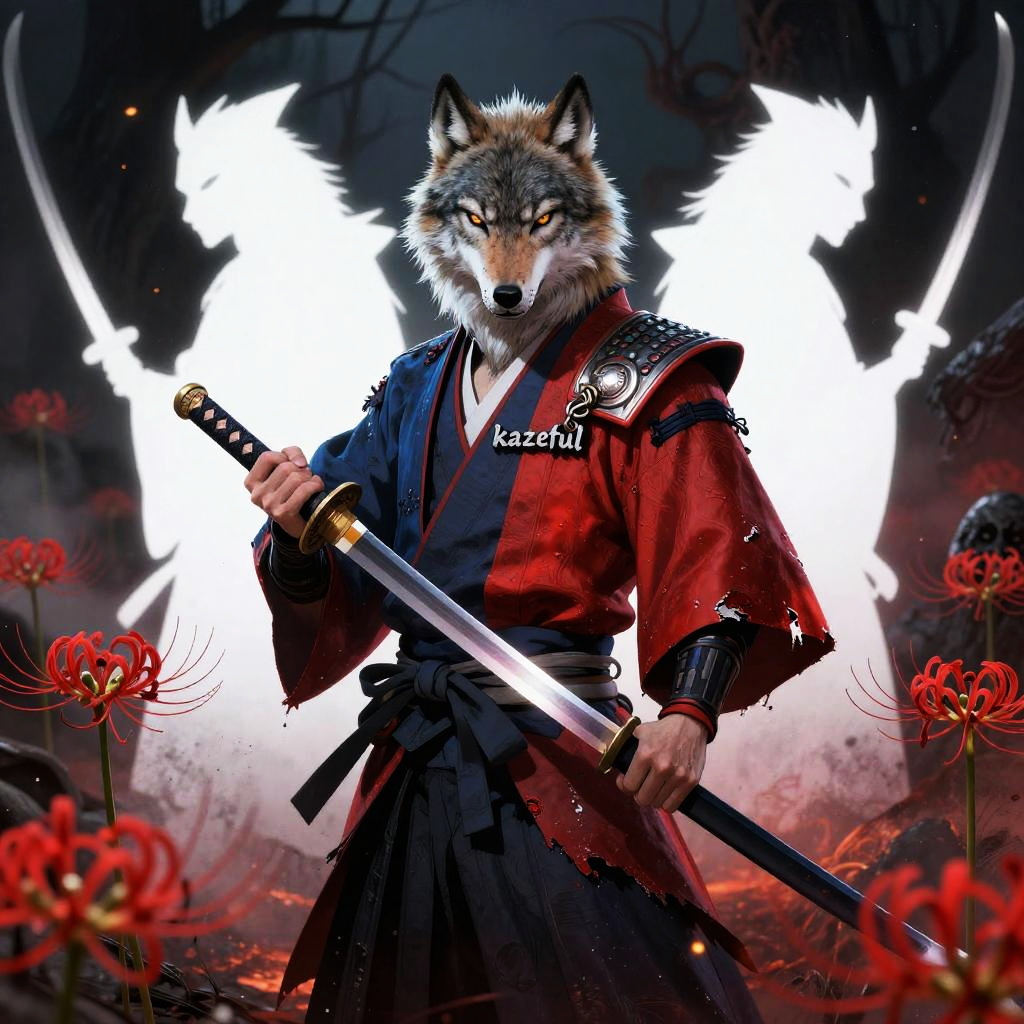 Ghosts Inspired by the theme of heroes battling demons in a dark era, this design features a fierce Boar (onyx-war boar samurai, hulking tusked warrior) wielding a ōdachi / oversized nodachi (massive great-sword sized for the boar's bulk, blade nicked and blackened at the edge) as a demon slayer. The word kazeful is incorporated as a charm on the sword, while the background depicts a raked gravel battlefield dotted with Higanbana (red spider lilies), collapsed bell towers and torn prayer-scroll demons drifting like shredded paper to evoke a fractured hell to convey the concept of hell. The warrior representing justice is depicted in bright hellfire-orange, slate-gray bristle highlights and burnished iron trim with ember-red accents to signify justice, while the demons behind him are depicted as white negative-space silhouettes fractured like broken glass with sumi-ink bleeding edges and warped reflections that fracture the hero's image, symbolizing the contrast between the two worlds.
