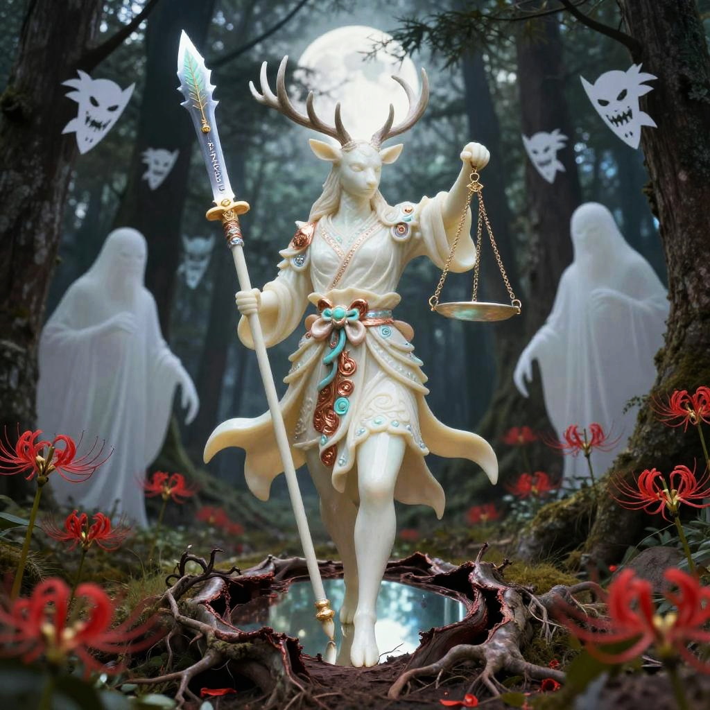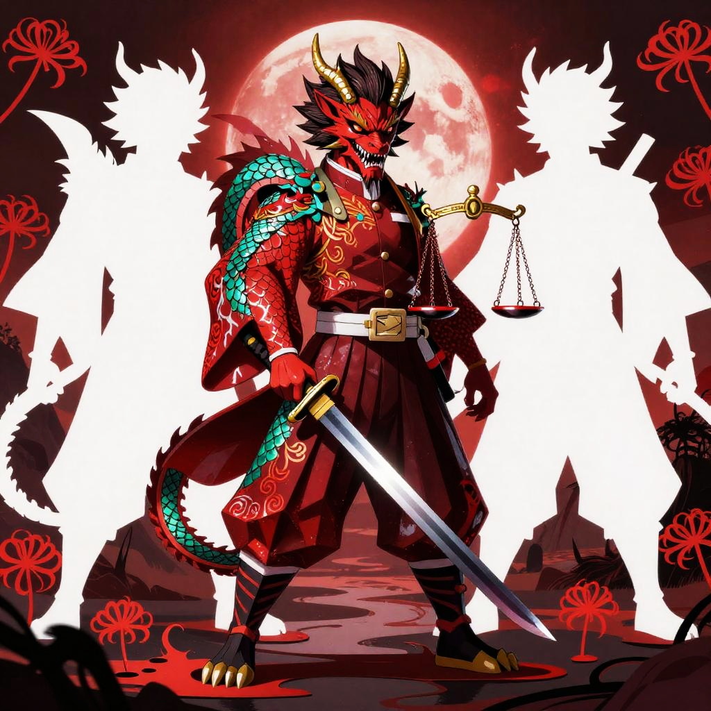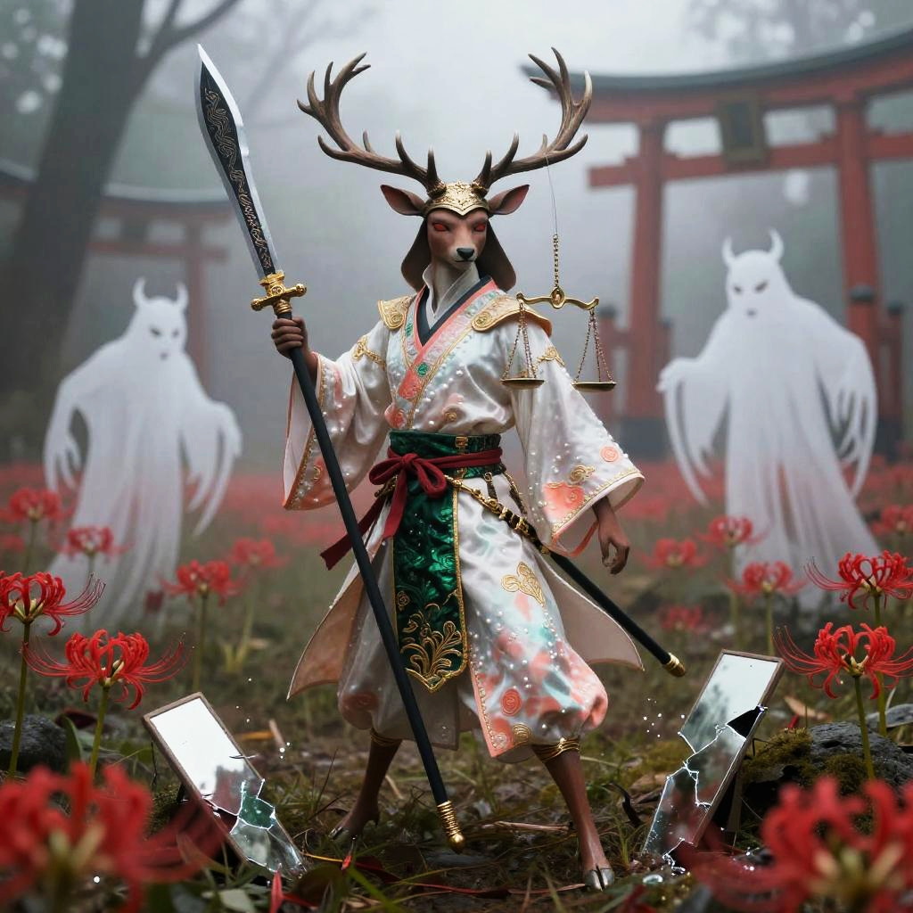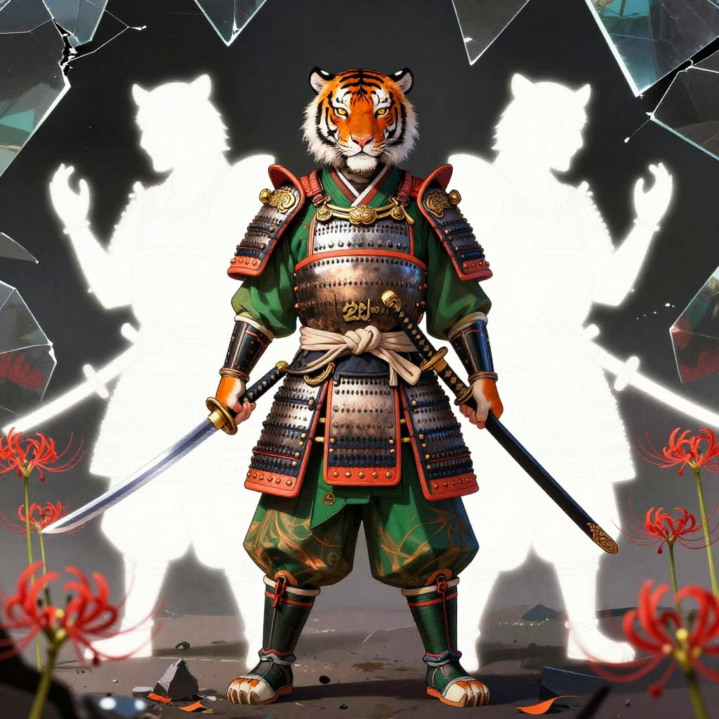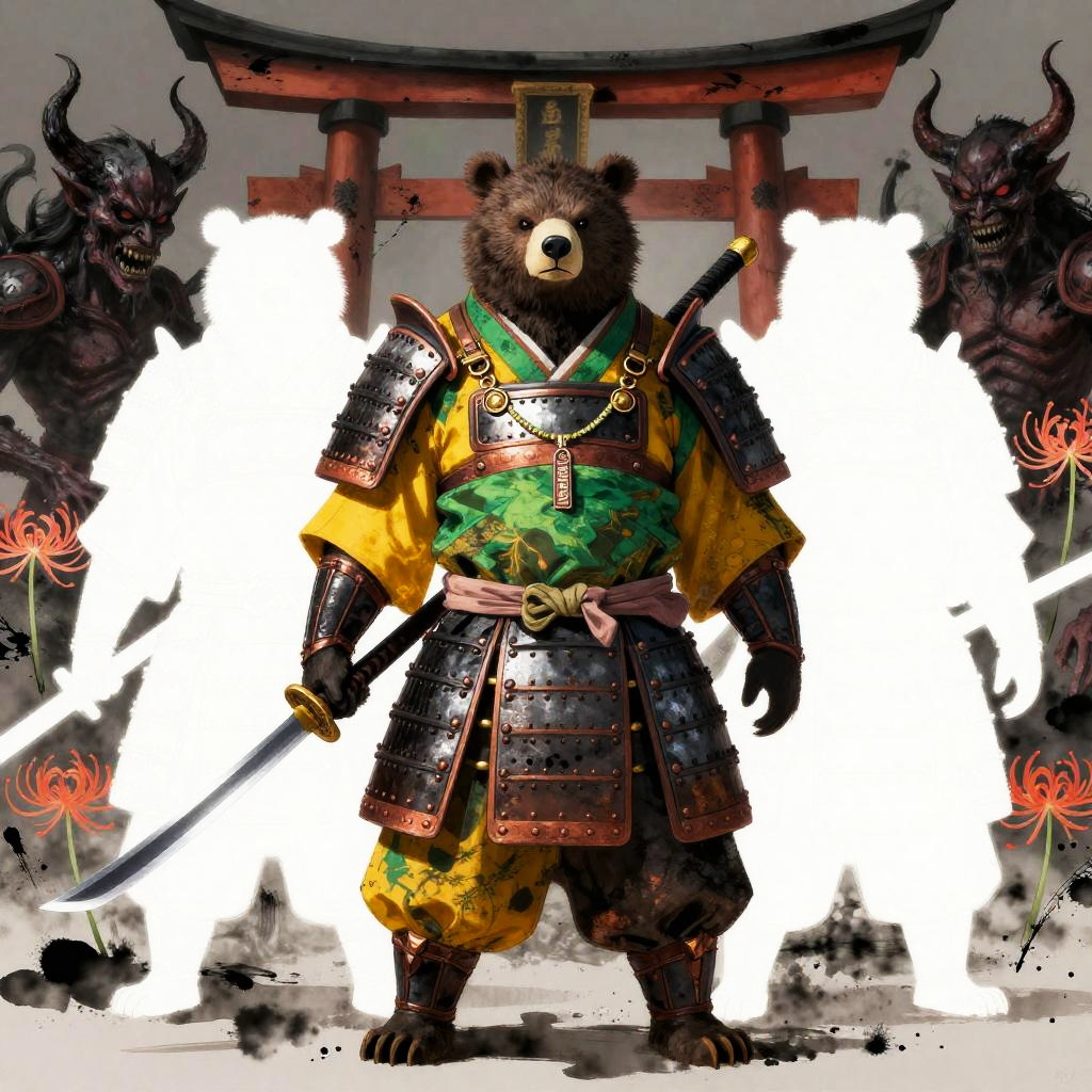 Ghosts Inspired by the theme of heroes battling demons in a dark era, this design features a fierce Boar (onyx-war boar samurai, hulking tusked warrior) wielding a ōdachi / oversized nodachi (massive great-sword sized for the boar's bulk, blade nicked and blackened at the edge) as a demon slayer. The word kazeful is incorporated as a charm on the sword, while the background depicts a raked gravel battlefield dotted with Higanbana (red spider lilies), collapsed bell towers and torn prayer-scroll demons drifting like shredded paper to evoke a fractured hell to convey the concept of hell. The warrior representing justice is depicted in bright hellfire-orange, slate-gray bristle highlights and burnished iron trim with ember-red accents to signify justice, while the demons behind him are depicted as white negative-space silhouettes fractured like broken glass with sumi-ink bleeding edges and warped reflections that fracture the hero's image, symbolizing the contrast between the two worlds.