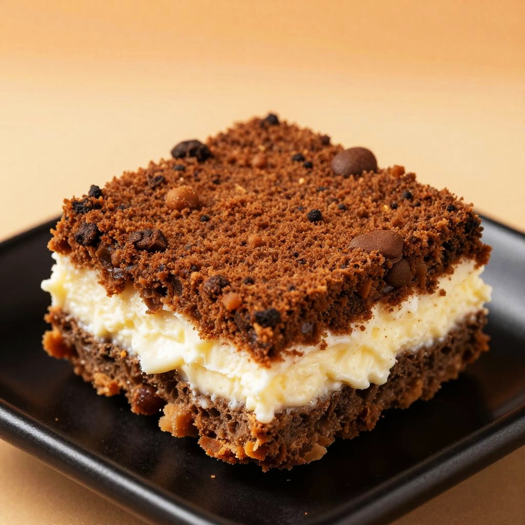 This is a close-up photograph of a square dessert with a rich, brown, crumbly top layer, and a thick, creamy, white filling sandwiched in between. The dessert has a slightly messy, textured appearance with visible layers. It's placed on a black, square plate, and the background is a warm, orange gradient. The focus is sharp on the dessert, highlighting its textures.