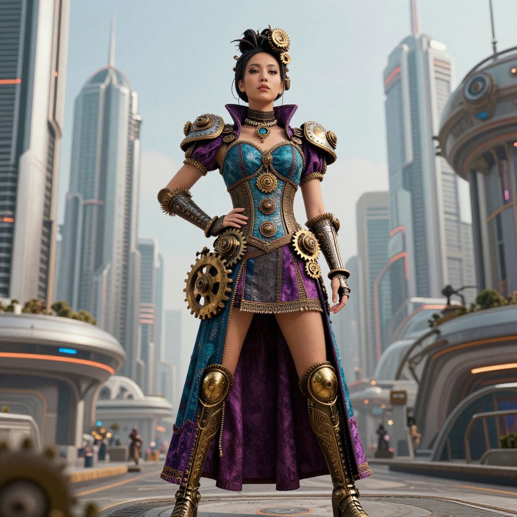 A stunning woman stands confidently in a futuristic urban landscape, showcasing intricate steampunk-inspired fashion. The striking use of gears and vibrant colors highlights an imaginative blend of technology and artistry against a backdrop of towering, futuristic skyscrapers.