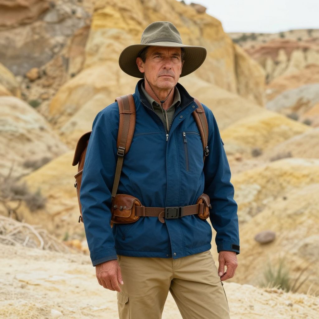Portrait of a middle-aged male explorer wearing a wide-brimmed hat, blue jacket, and khaki pants. He has a brown leather backpack and a serious expression, standing in a rugged outdoor environment with rocky and yellow cliff formations in the background.