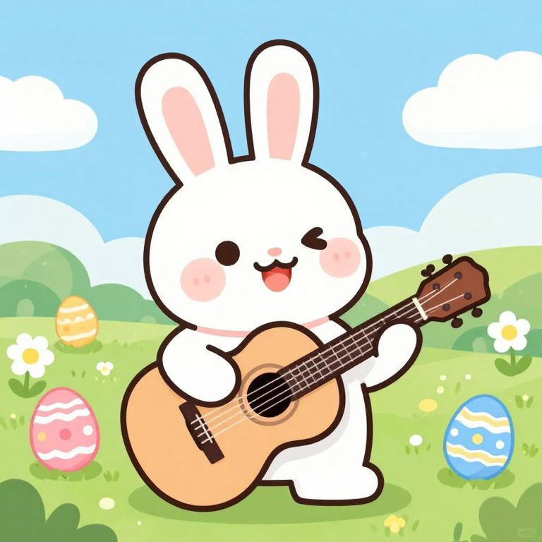 A cheerful cartoon-style bunny strums a guitar amidst a vibrant spring setting, surrounded by colorful Easter eggs and daisies, rendered in a bright, high-definition vector art style.