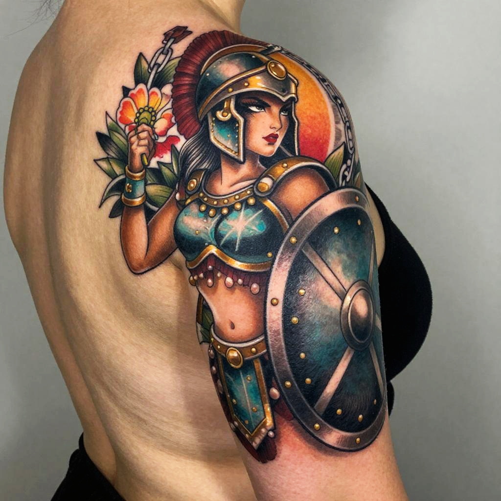 Female warrior tattoo, neo-traditional style, fierce female gladiator with shield and helmet, rich jewel-toned palette with gold accents, floral background intertwined with chains, dynamic composition on back shoulder