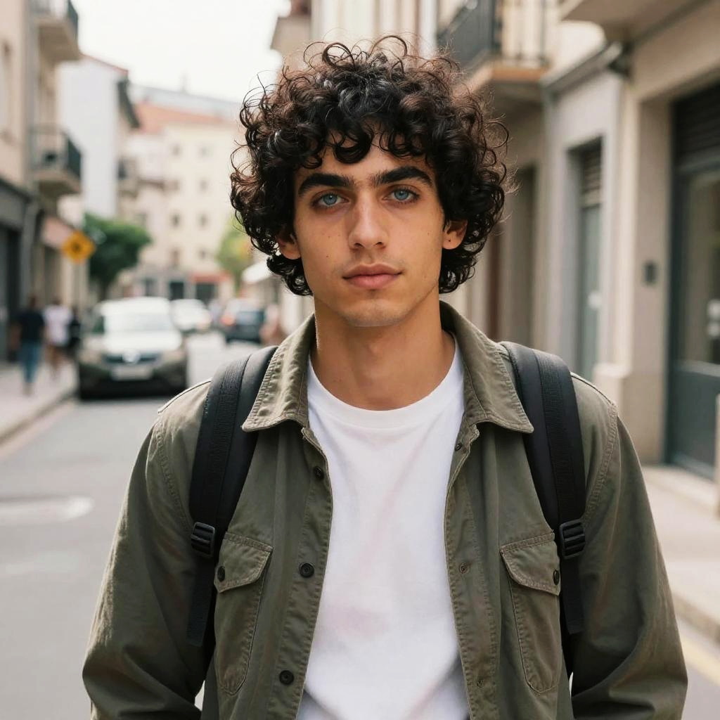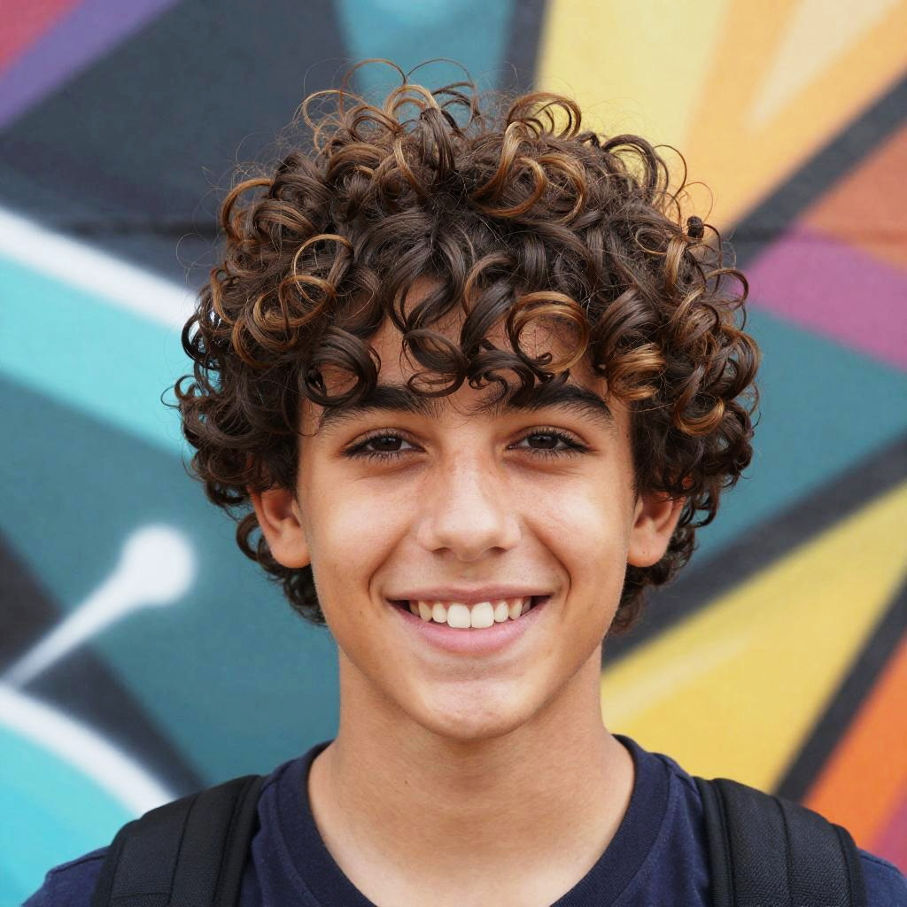 Hispanic adolescent with light brown hair, curly locks falling over forehead, playful smile, bright natural light, colorful street art backdrop, lively and youthful atmosphere