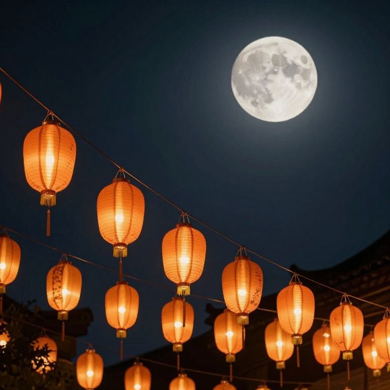 Luminous orange lanterns ascend gracefully against a darkened sky, their warm glow trailing delicate strings that weave through the air, encircling a radiant full moon that casts a serene, ethereal light over the scene.