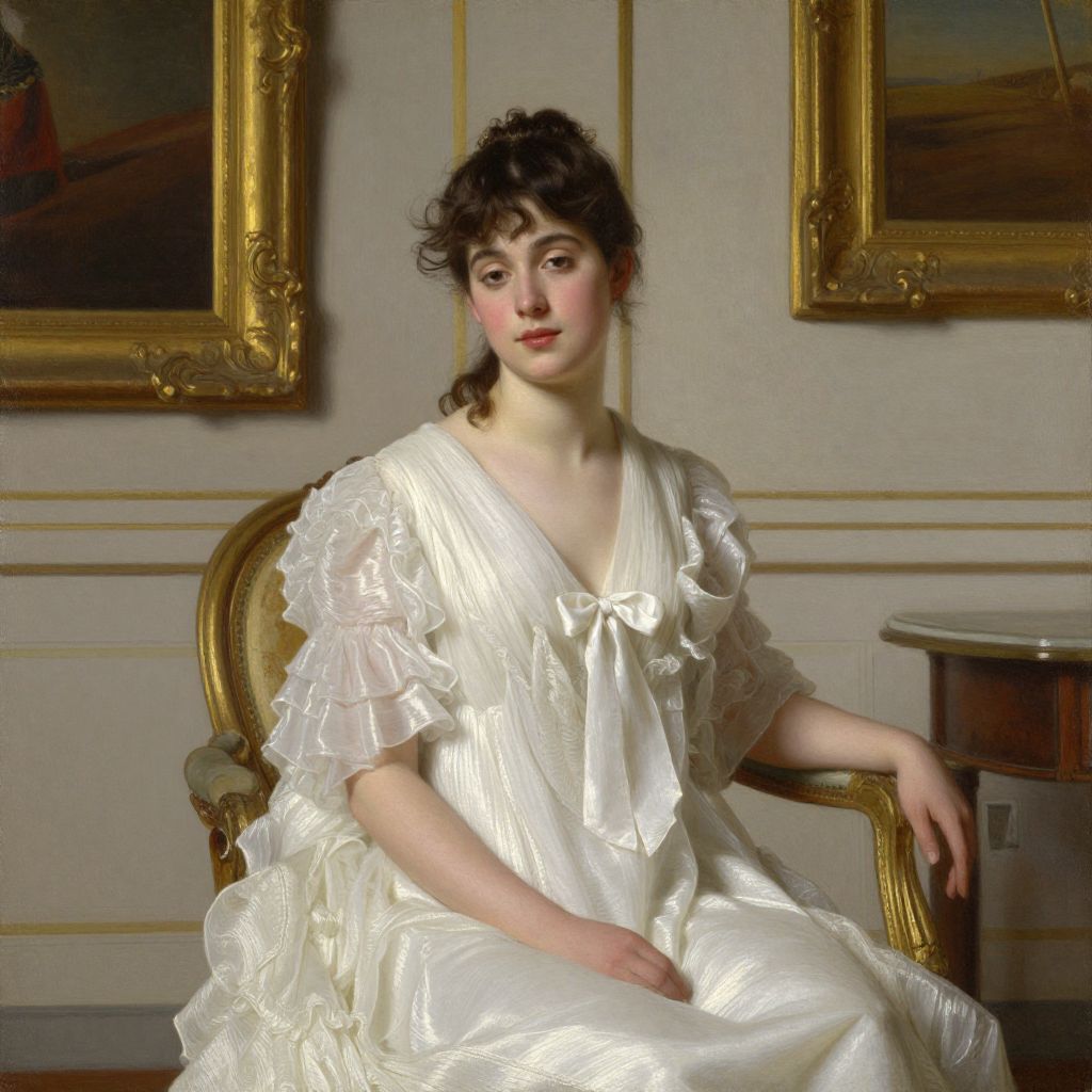 Photograph-style painting of a young Caucasian woman with fair skin and dark, curly hair styled in an updo. She sits in an ornate, gold-framed armchair, wearing a white, semi-sheer, ruffled dress with a ribbon bow at the chest. The background features an elegant, cream-colored wall with gold trim and two large, gold-framed paintings. Her expression is calm and slightly melancholic, with a soft pink blush on her cheeks. The lighting highlights the delicate textures of her dress and the luxurious chair. A small, wooden side table is visible to her right.
