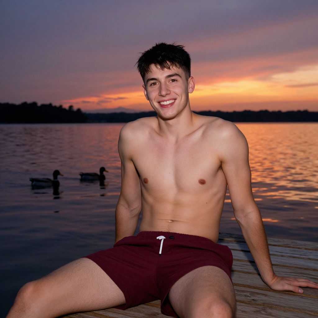 Photograph of a young, shirtless Caucasian man with short, dark hair, and a lean, toned physique, sitting on a wooden dock at sunset. He has a bright smile, showing white teeth, and is wearing maroon swim trunks with a white drawstring. The background features a calm lake with three ducks floating in the water and a silhouetted tree line. The sky is a gradient of warm orange and purple hues, reflecting on the water's surface. The man's skin is fair, and the lighting emphasizes his muscular definition. The overall scene is serene and picturesque.