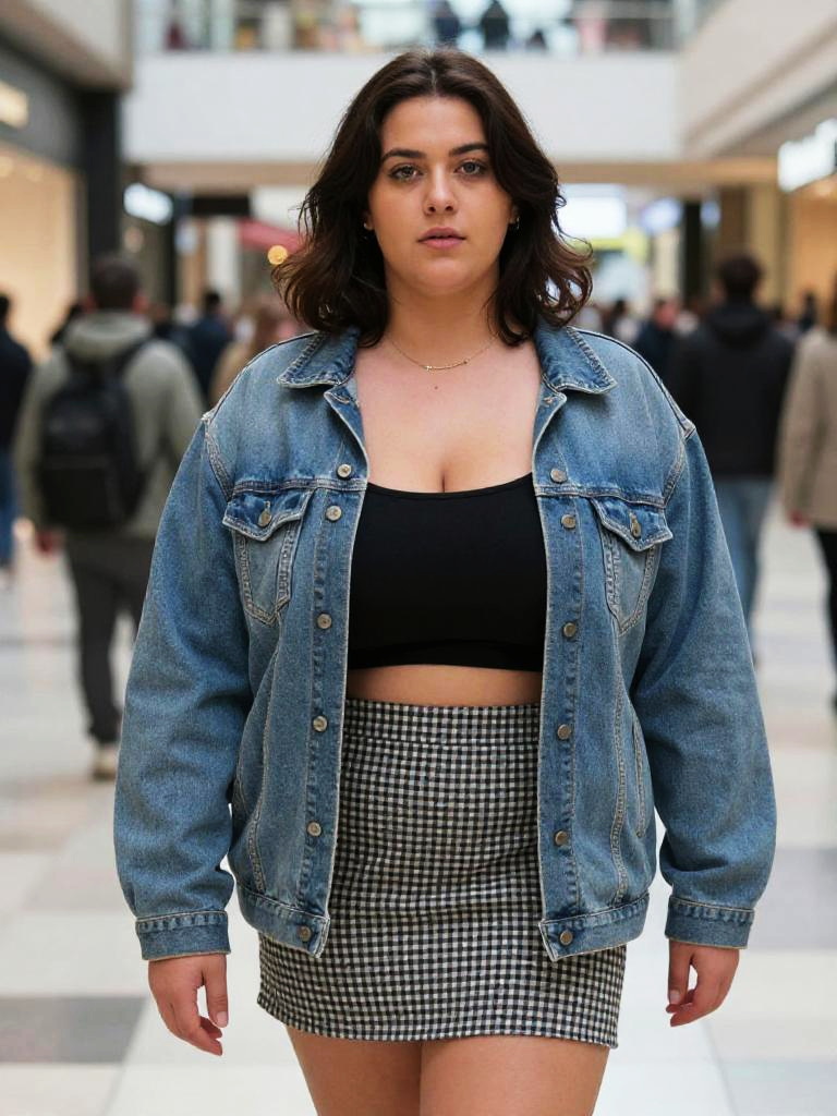 Photograph of a curvy woman with wavy brown hair, wearing a yellow sweater, high-waisted blue jeans, and brown boots, standing