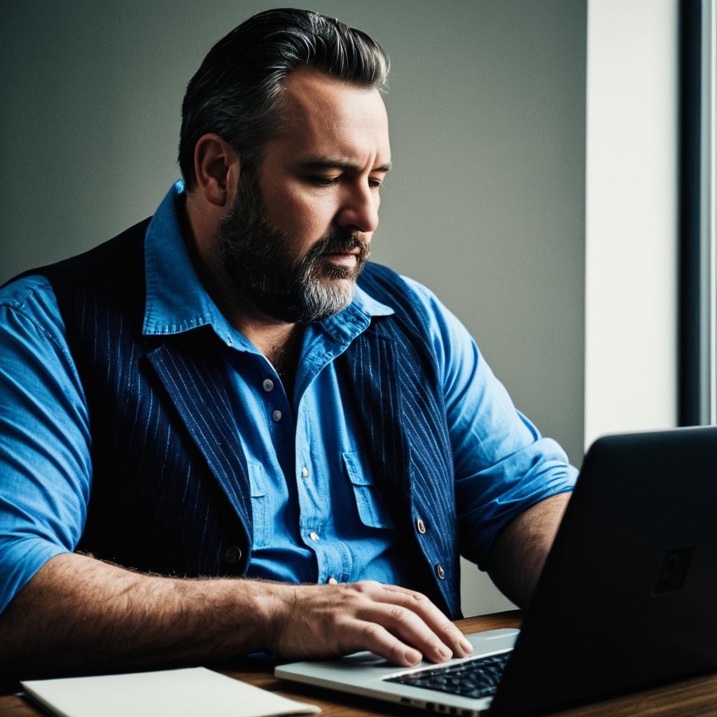 Large Man Clothing, man in a blue shirt and vest looking at a laptop