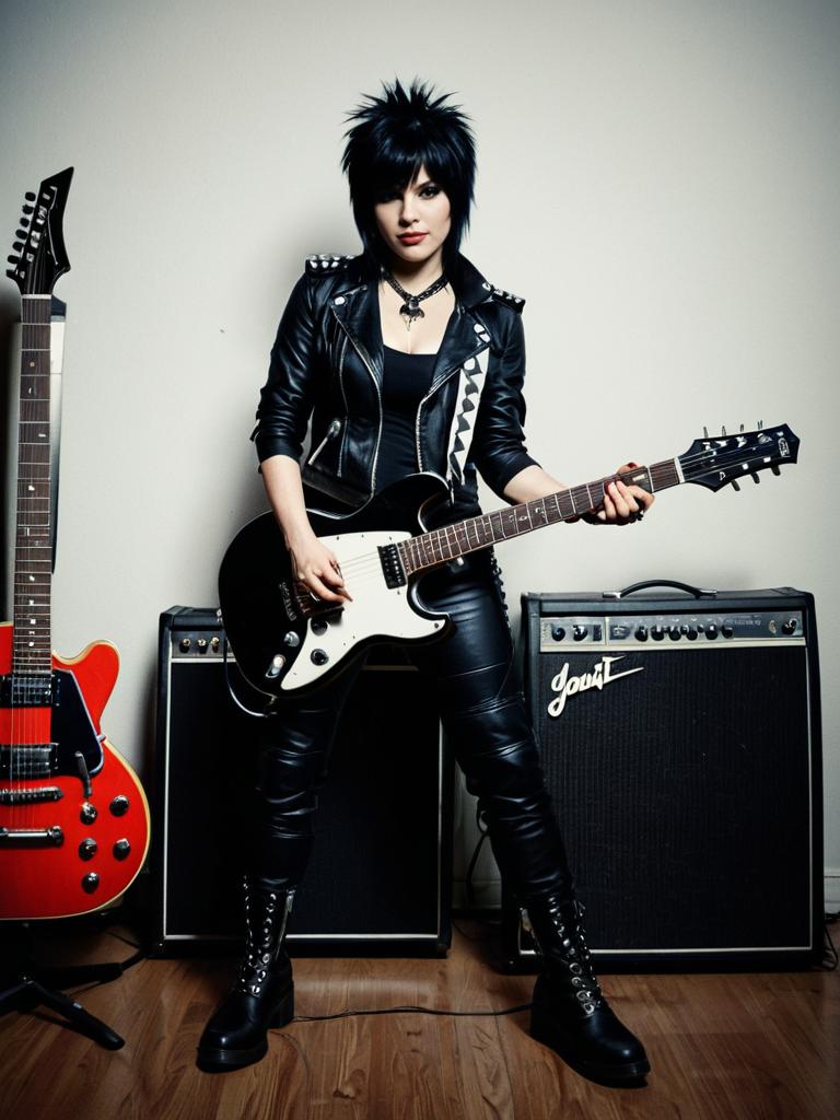 Woman in Joan Jett Outfit, full-body cosplay photo with electric guitar prop