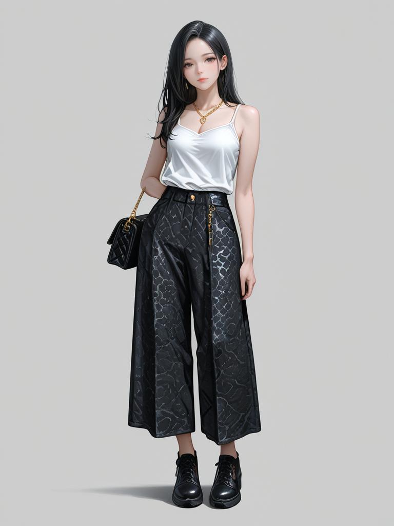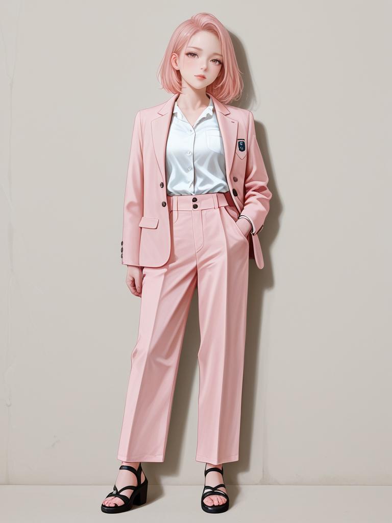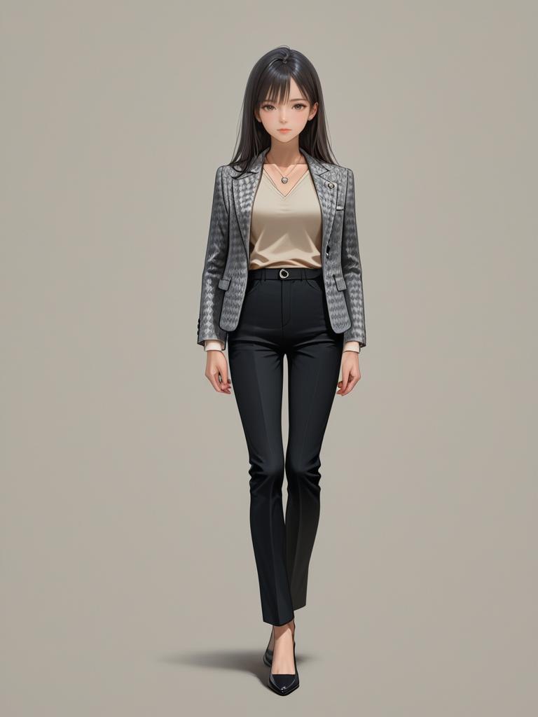 1girl, realistic face, full body shot, Woman, business casual, houndstooth pattern blazer with draped lapel, long sleeves, tan top, scoop neckline, slim-fitting black pants, pendant necklace.