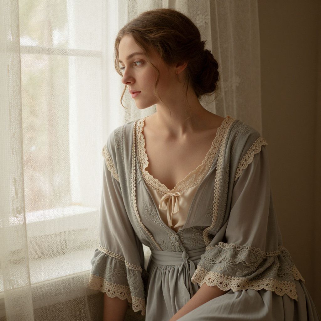 Nonnude portrait of a serene woman in soft natural light, wearing elegant vintage clothing, sitting by a window with lace curtains, warm tones, delicate details, peaceful atmosphere, realistic style, high resolution