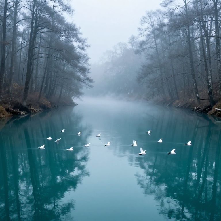 Photograph of a misty, serene forest lake with a narrow, clear blue waterway reflecting the tall, leafless trees on either side. A flock of white birds is mid-flight, scattered across the center of the water. The mist creates a soft, ethereal atmosphere, blending the background and forest edges. The trees are thin and tall, with dark, bare branches. The overall color palette is cool, dominated by blue and gray tones, with the bright white of the birds providing contrast. The image conveys a peaceful, almost magical woodland scene.