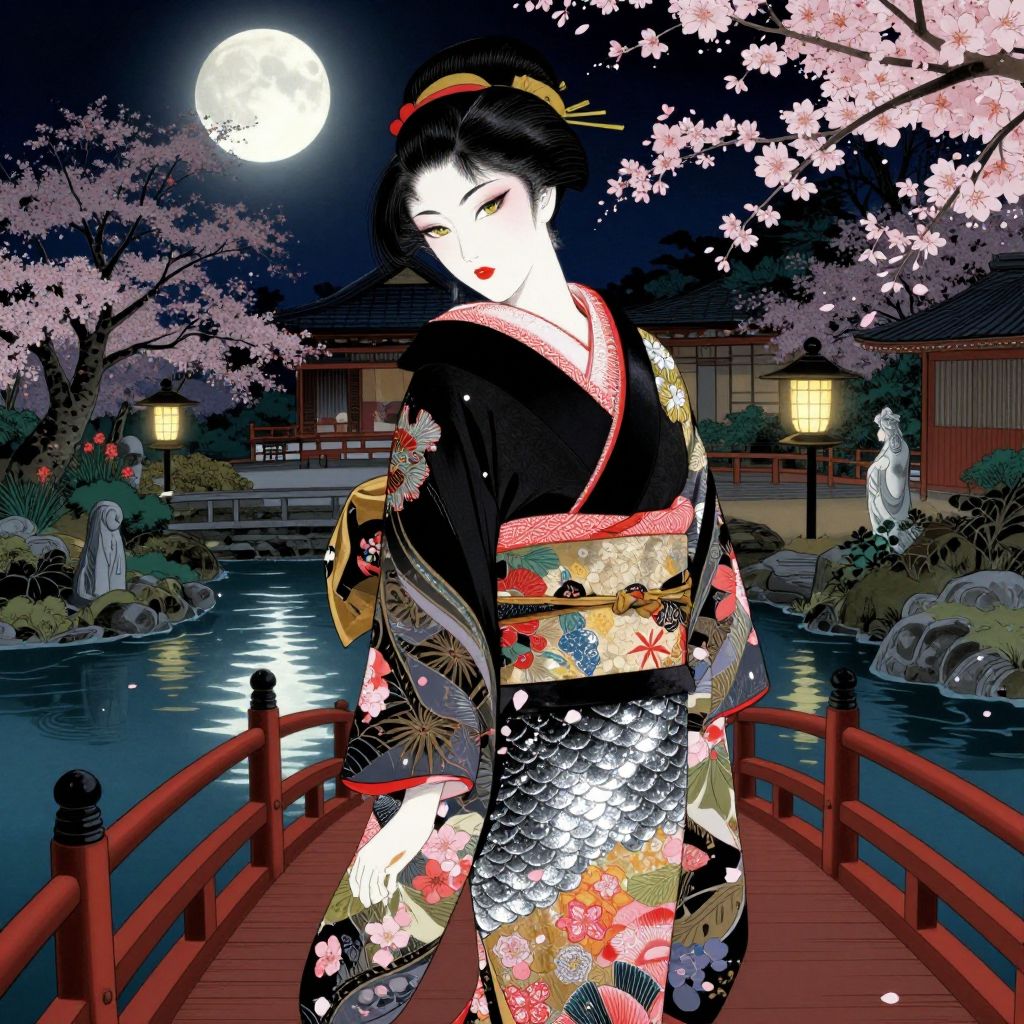 Digital illustration of a serene Japanese woman with blue feathered kimono, holding a fan, in a moonlit forest, surrounded by glowing lights.