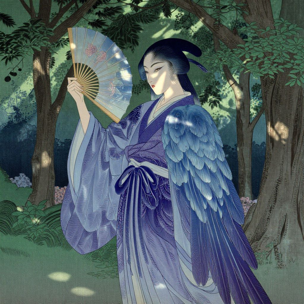 Visualize an enchanting blend of surrealism and ukiyo-e woodblock printing styles. An enigmatic entity, half-human and half-bird, stands in a serene glade, its intricate line work reminiscent of traditional Japanese landscapes. The creature's feathers seamlessly transform into flowing robes, bathed in mesmerizing shades of blue and purple that shimmer under the soft sunlight filtering through the verdant canopy. Holding a fan crafted from delicate, translucent wings, this ethereal being gracefully fans itself, casting alluring shadows on its visage. The serene tranquility and air of mystique evoke a profound sense of wonder and intrigue as viewers are drawn into the secrets hidden within this captivating realm.