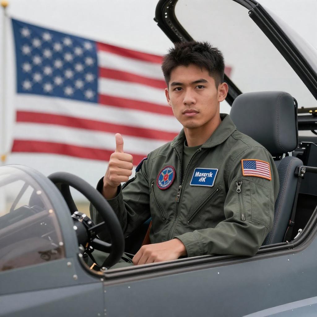 Man with short black hair, sunglasses, and black shirt, holds colorful kite with cartoon face and American flag design. Kite has red, white, and blue colors with diamond shapes. Background: green hill, concrete blocks, trees. Sunny day. Man smiles.