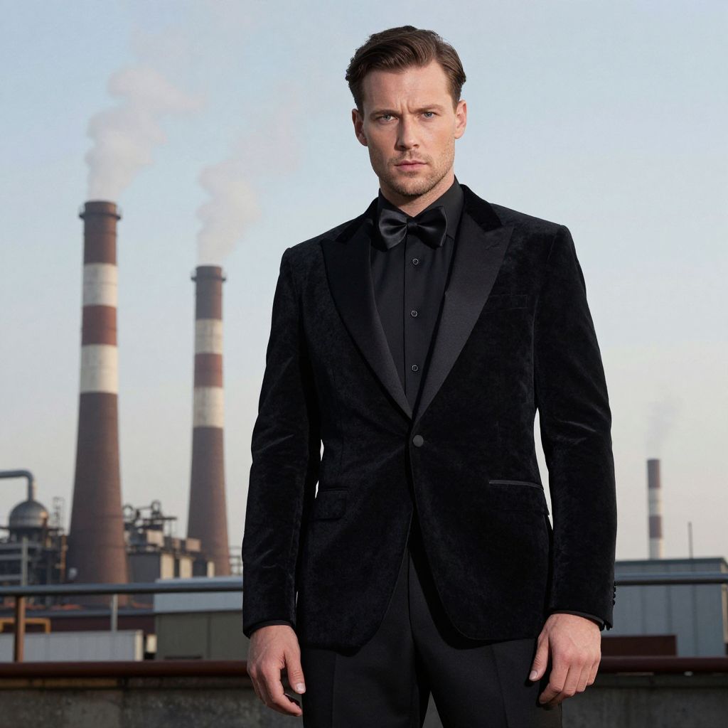 A man, classic formal attire, black dress shirt, velvet tuxedo jacket, black silk bow tie, black dress pants, industrial landscape, steam rising from stacks, medium format film, confident expression Man has masculine face and piercing eyes